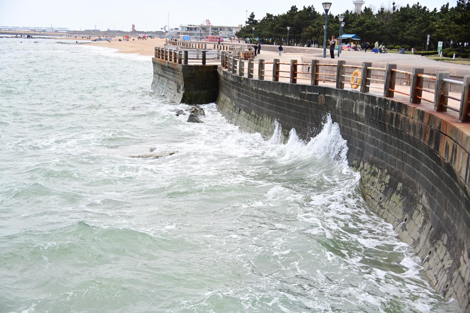 沿着海滨往前走,走边走看,看海浪拍打护堤,不停不息。