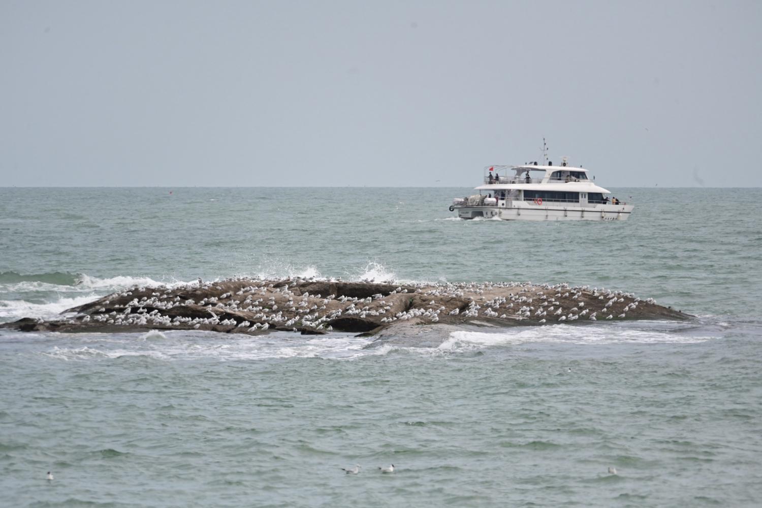 海中的礁石上,停着更多的海鸥。