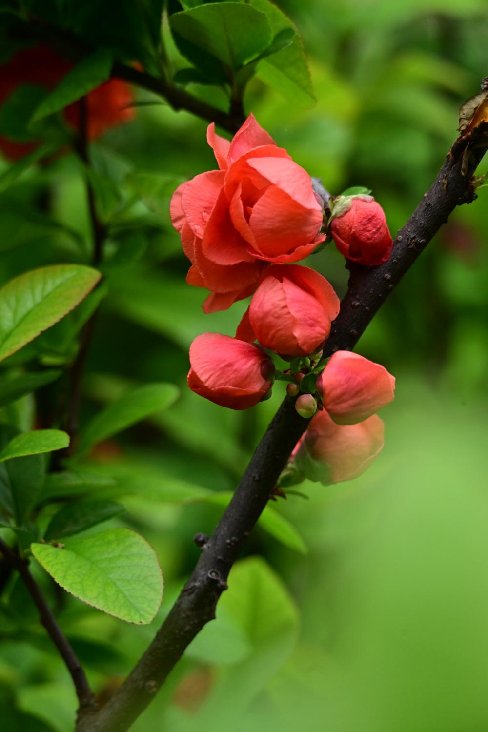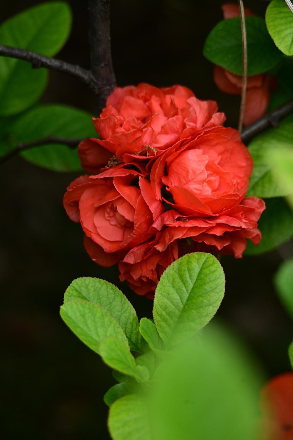 重瓣的贴梗海棠,花瓣层层叠叠,饱满艳丽,如同迷你牡丹。