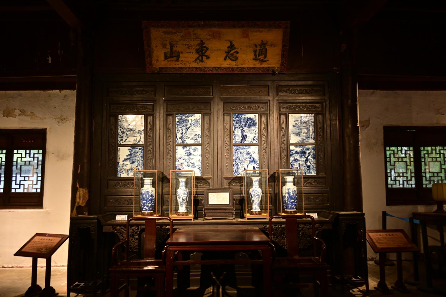 匾额下方的木格内嵌青花山水瓷板画,搭配堂前的青花瓶陈设,是典型的清代厅堂布局,寓意 “平(瓶)平安安”。