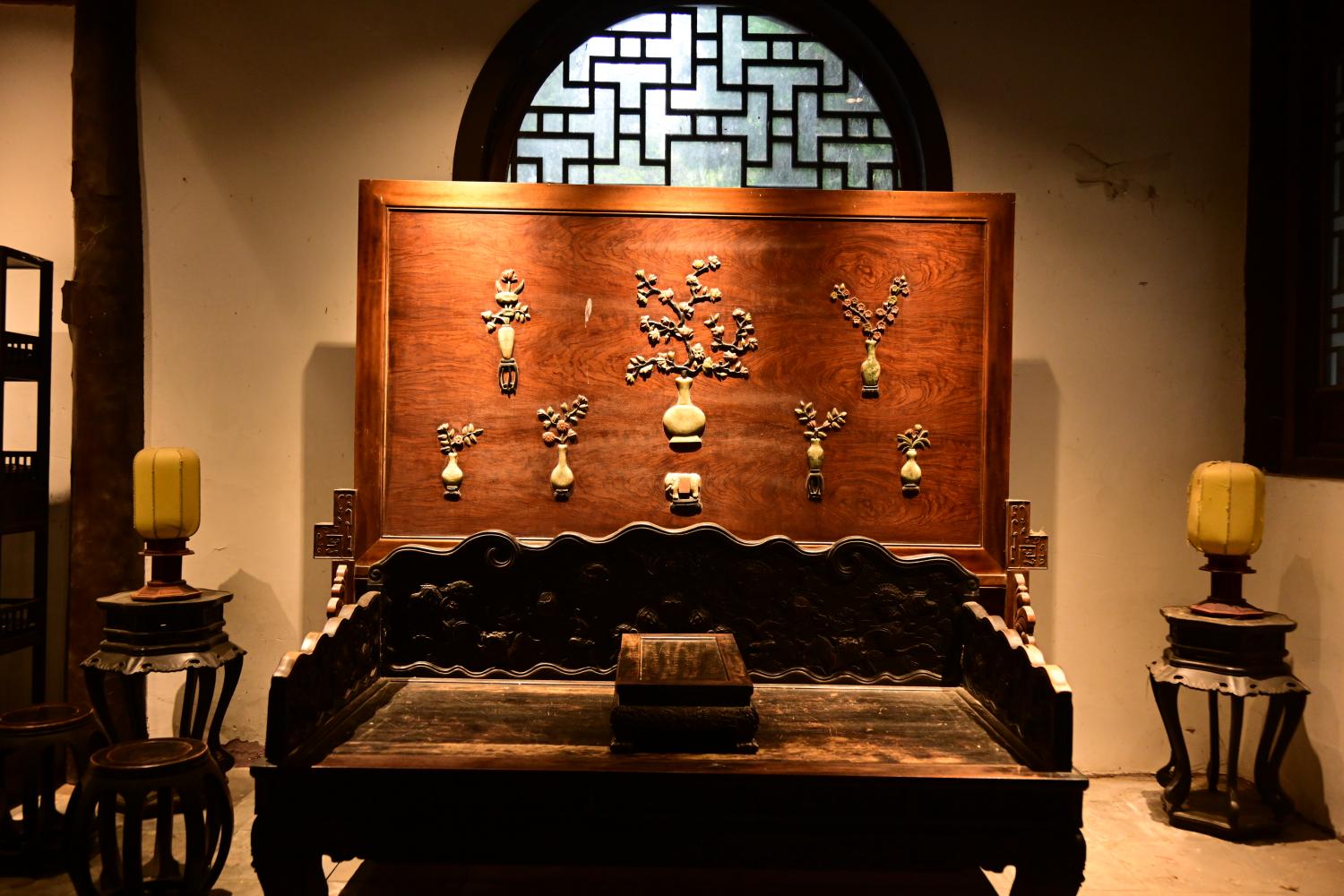 堂内的嵌玉罗汉床是清代硬木家具的精品。床围板以红木为底,镶嵌玉石雕刻的瓶花图案,寓意 “平(瓶)安富贵”,也是当时文人厅堂常见的陈设。床前的宫灯、花几搭配,完整还原了清代官宦世家的室内陈设风貌。