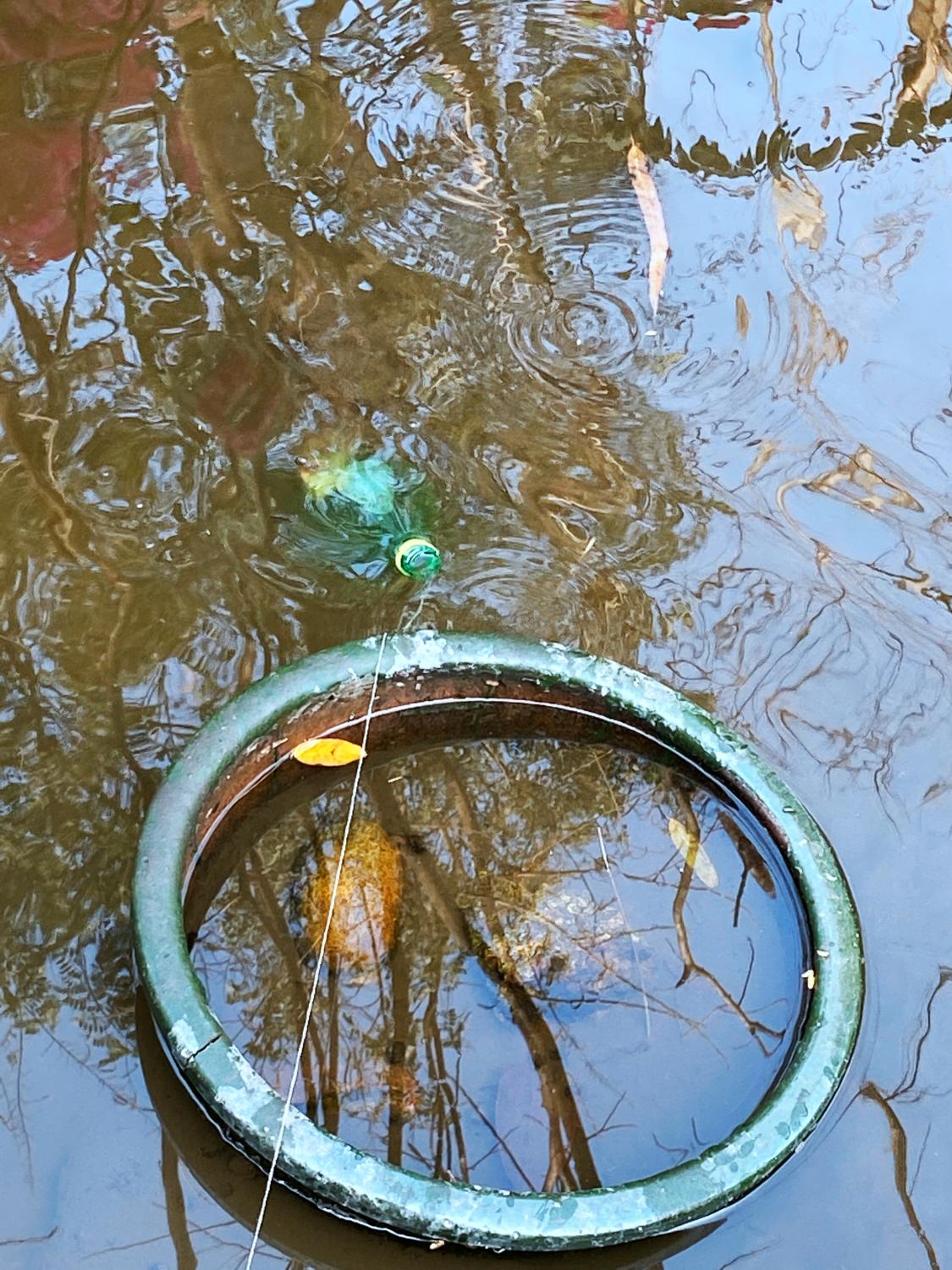把我们的捕鱼神器丢进池里,发现水太浅了,那只雪碧瓶子只能躺着。调换了几次位置,才勉强让瓶子立起来。