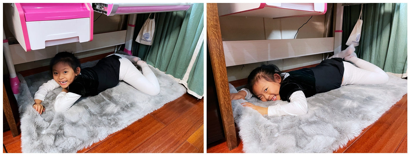 P28,天冷了,衣襟穿不住拖鞋,特意去山姆买了一块地垫,铺在书桌下面。衣襟喜欢毛绒绒,把地垫当成了地毯,甚至准备睡在上面。对来自家长端的制止,衣襟显然是不接受、不高兴的。