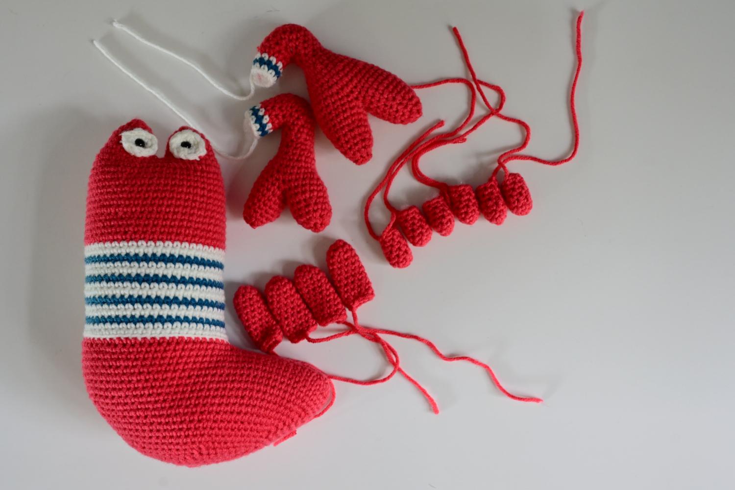 腿有六只,也是同样大小,钩好后一一缝合到身体的下部,一边缝一边找平衡,这一点很重要,因为要保证龙虾能有个漂亮的站姿。