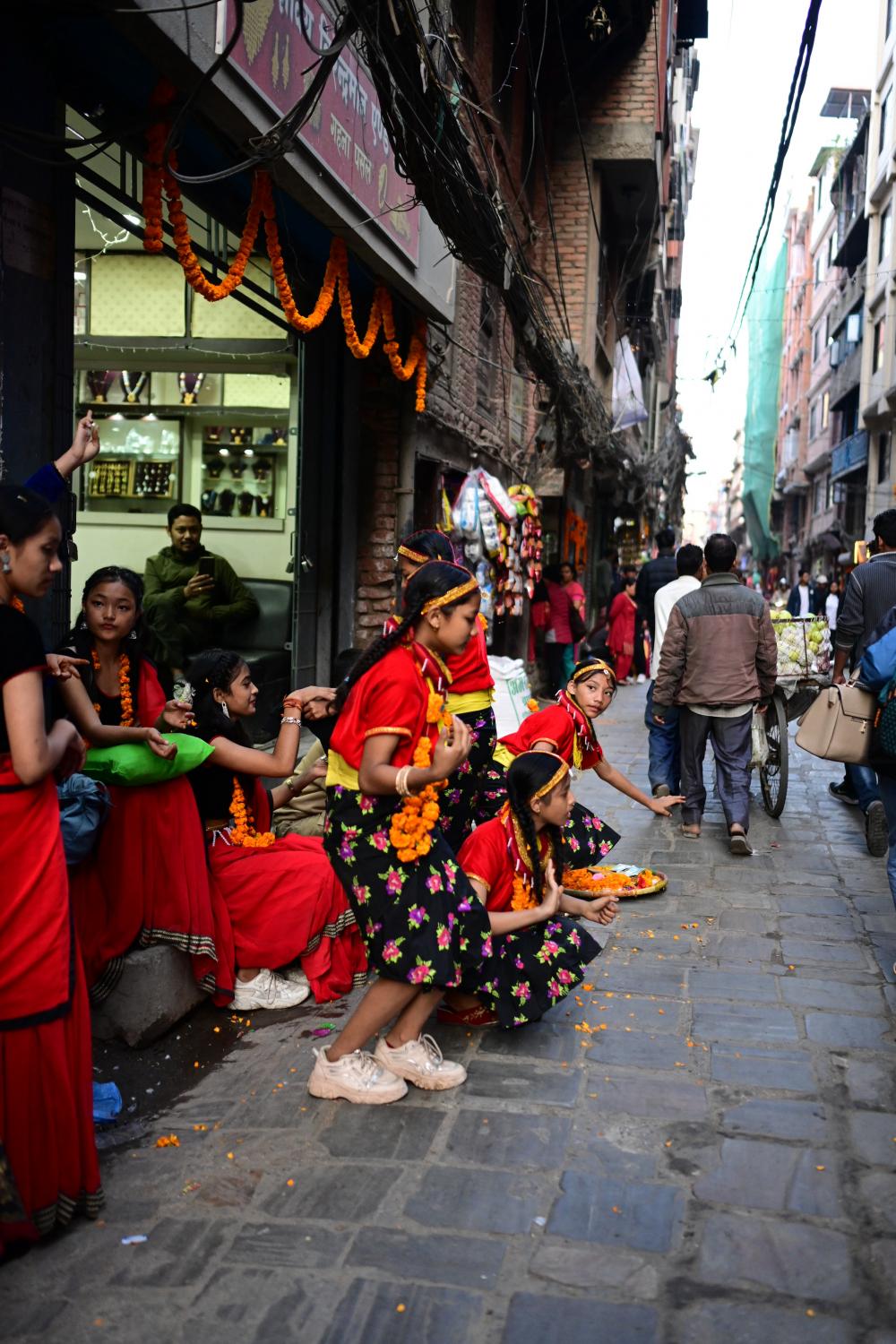 被讨到的人,会自然而然地停下来,往盘子里放些什么。具体是什么,是真的没看清。主要是不好奇,没有凑到近前看,只是远远地感受尼泊尔人的节日气氛,便足够了。
