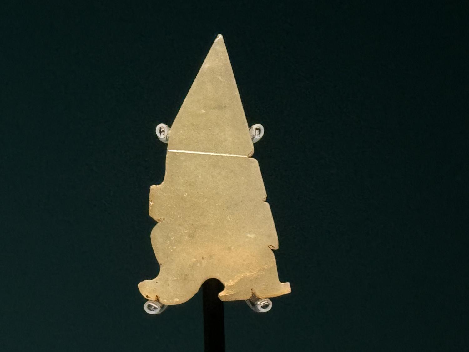 如侧视立人造型。头顶方冠,上有单面钻穿孔,孔内留有朱砂,外缘有5组扉牙。鸟喙外凸,边有穿孔。尾羽完整,爪部残。