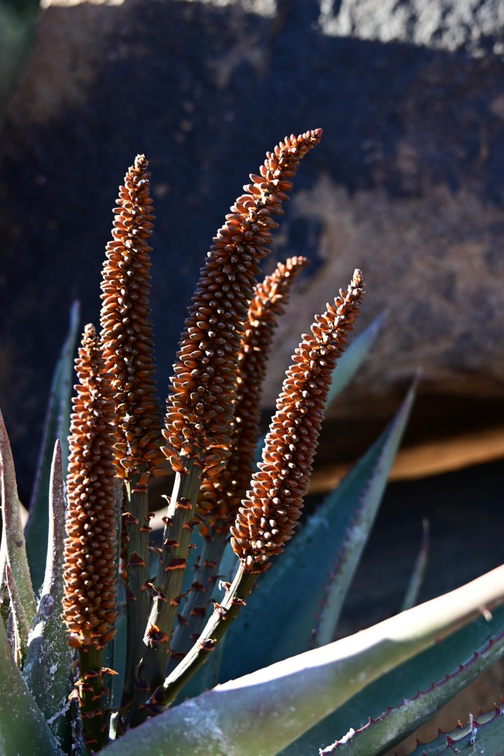 箭袋树在冬季也就是此时开花,花朵呈黄色,成簇状生长在枝条顶端,如前面图片中的一样;黄色的花朵比较显眼,有利于吸引鸟类和昆虫前来授粉;开花后结出种子,再通过风力进行传播。