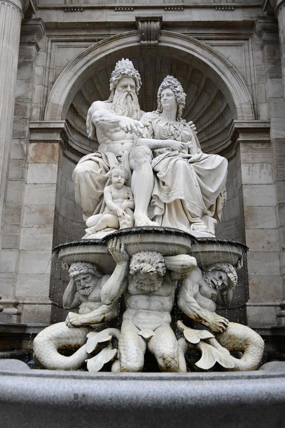 中间位置,是海王星喷泉,核心人物是罗马神话里的海洋主宰海神海王星,身旁的女性是他的妻子海洋女神安菲特里忒,整体围绕海洋神话主题创作,充满古典艺术的叙事感与表现力。