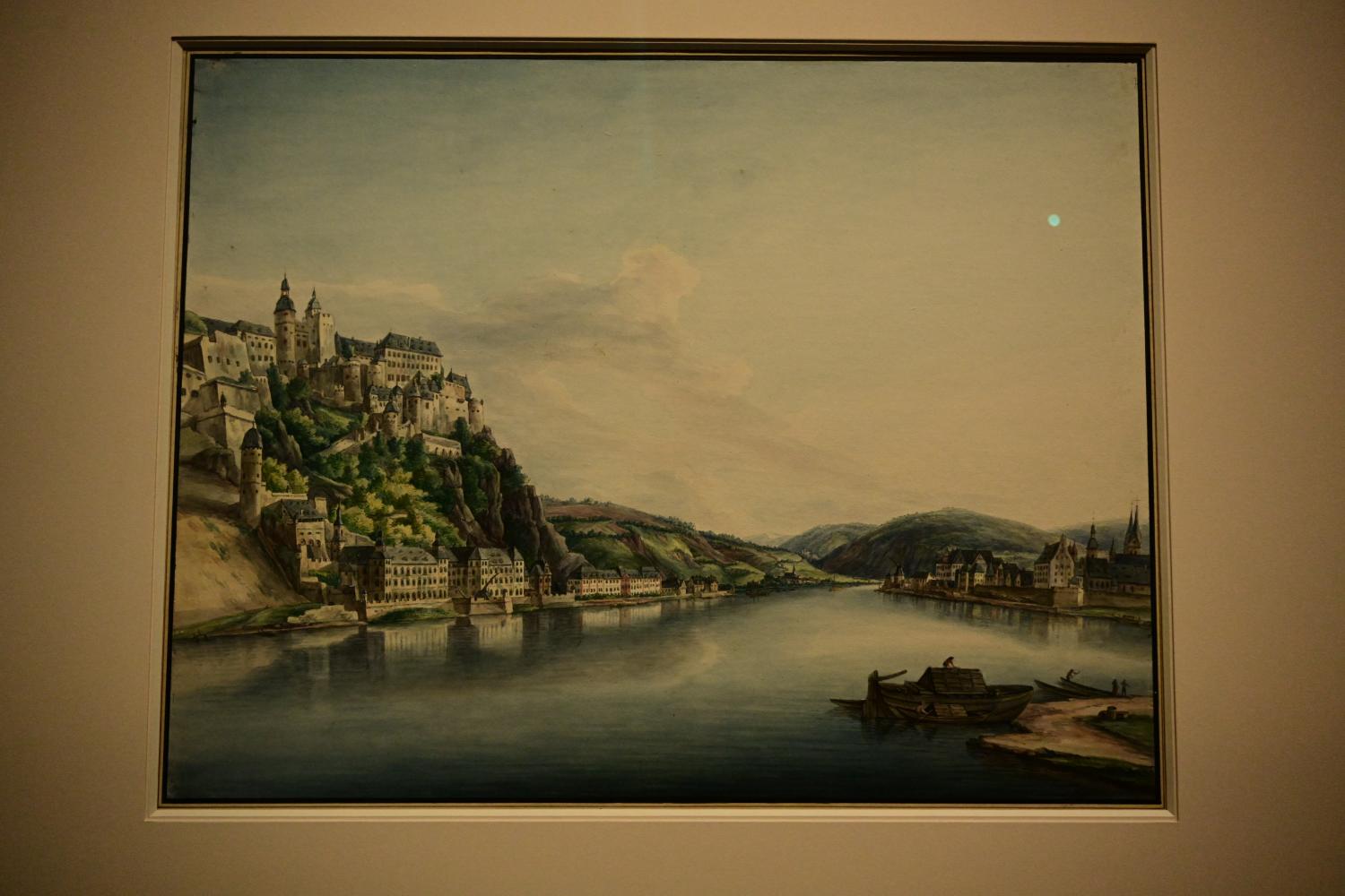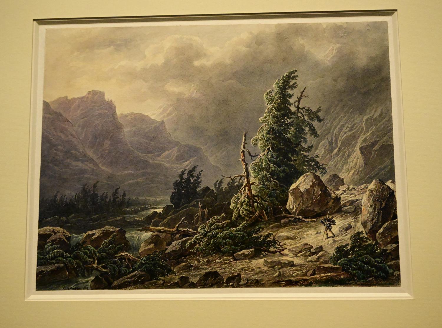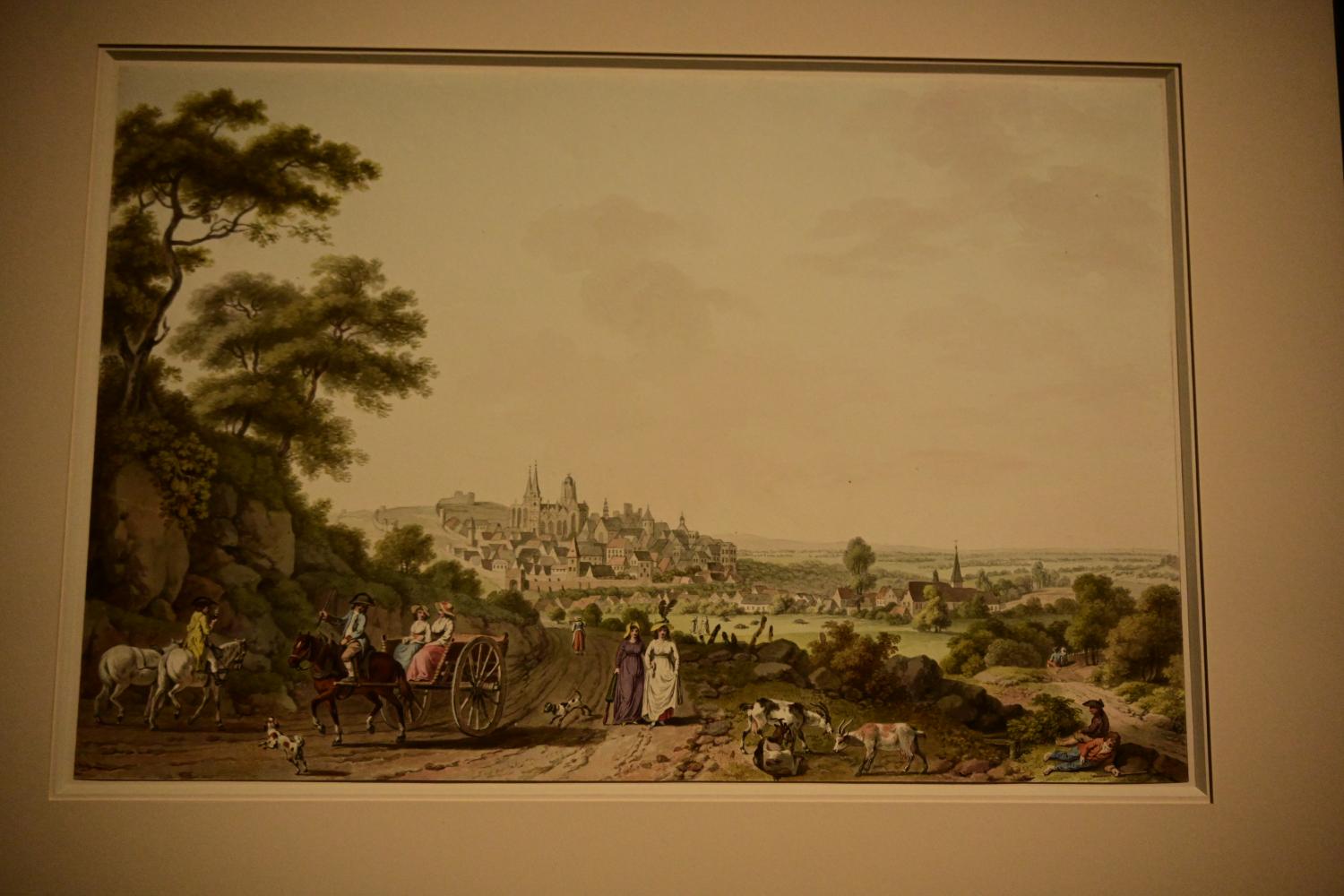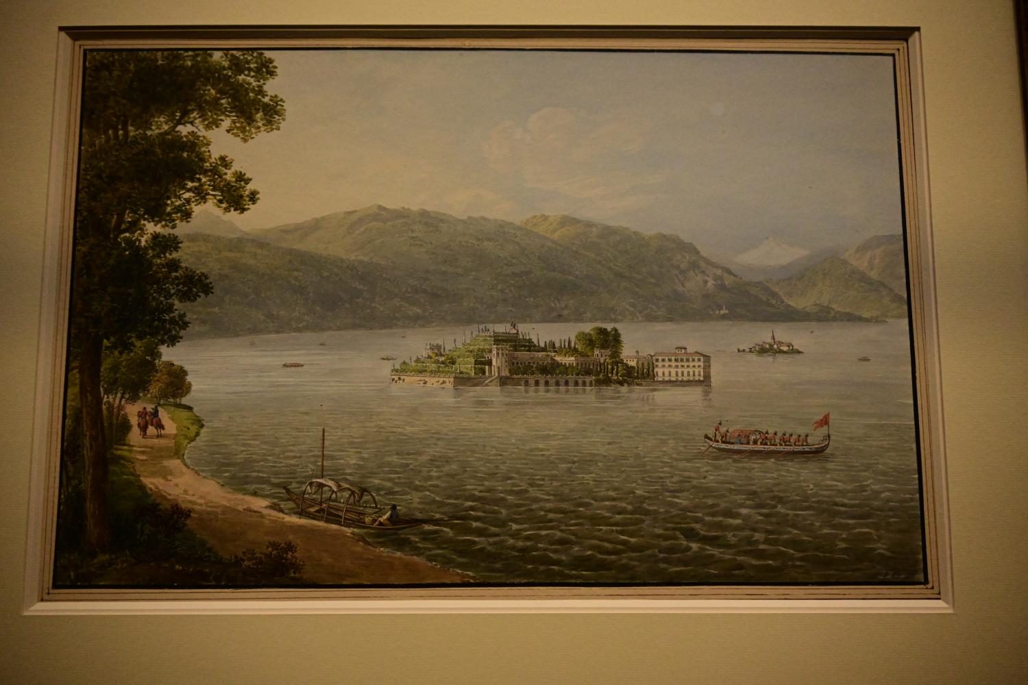 水彩技法的运用让画面色调清新且层次细腻:湖水的波纹、岛屿的绿意、远山的晕染都被精准呈现,既展现出贝拉岛的秀丽精致与马焦雷湖的开阔静谧,又传递出 自然景观与人文建筑和谐共生的诗意氛围,生动定格了19世纪初这片地域的独特风貌,饱含着对眼前景致的赞美与对自然人文之美的捕捉。