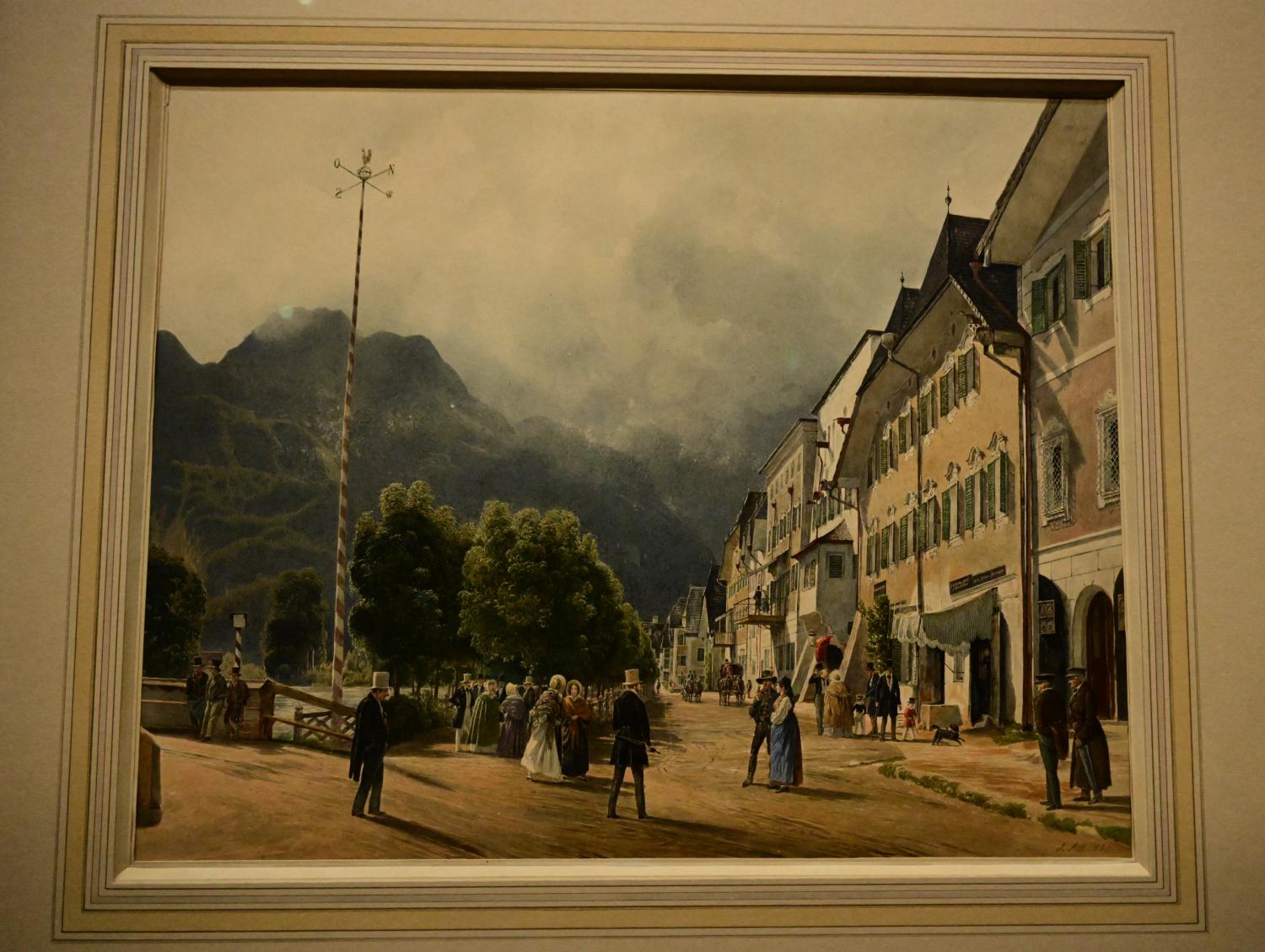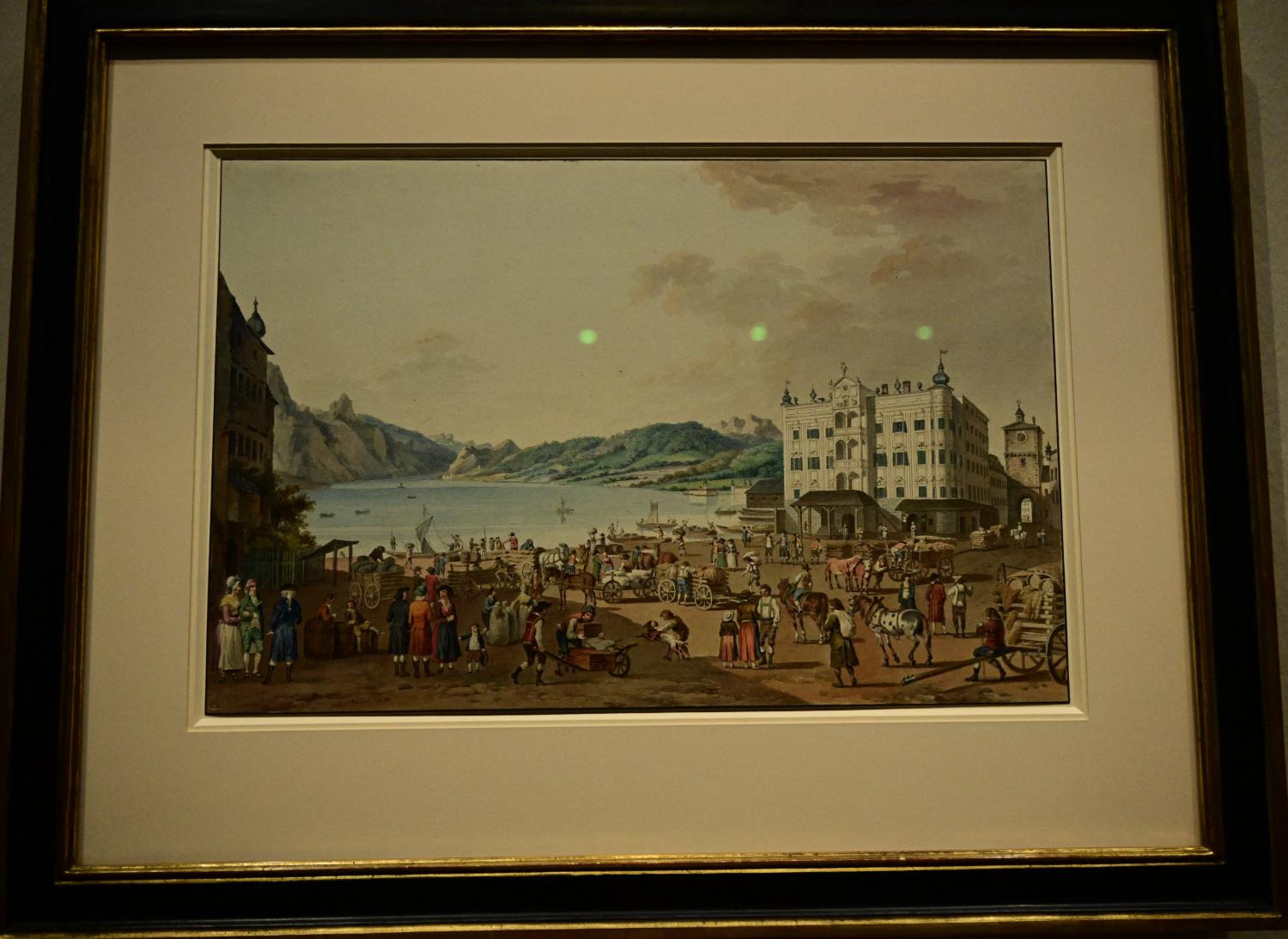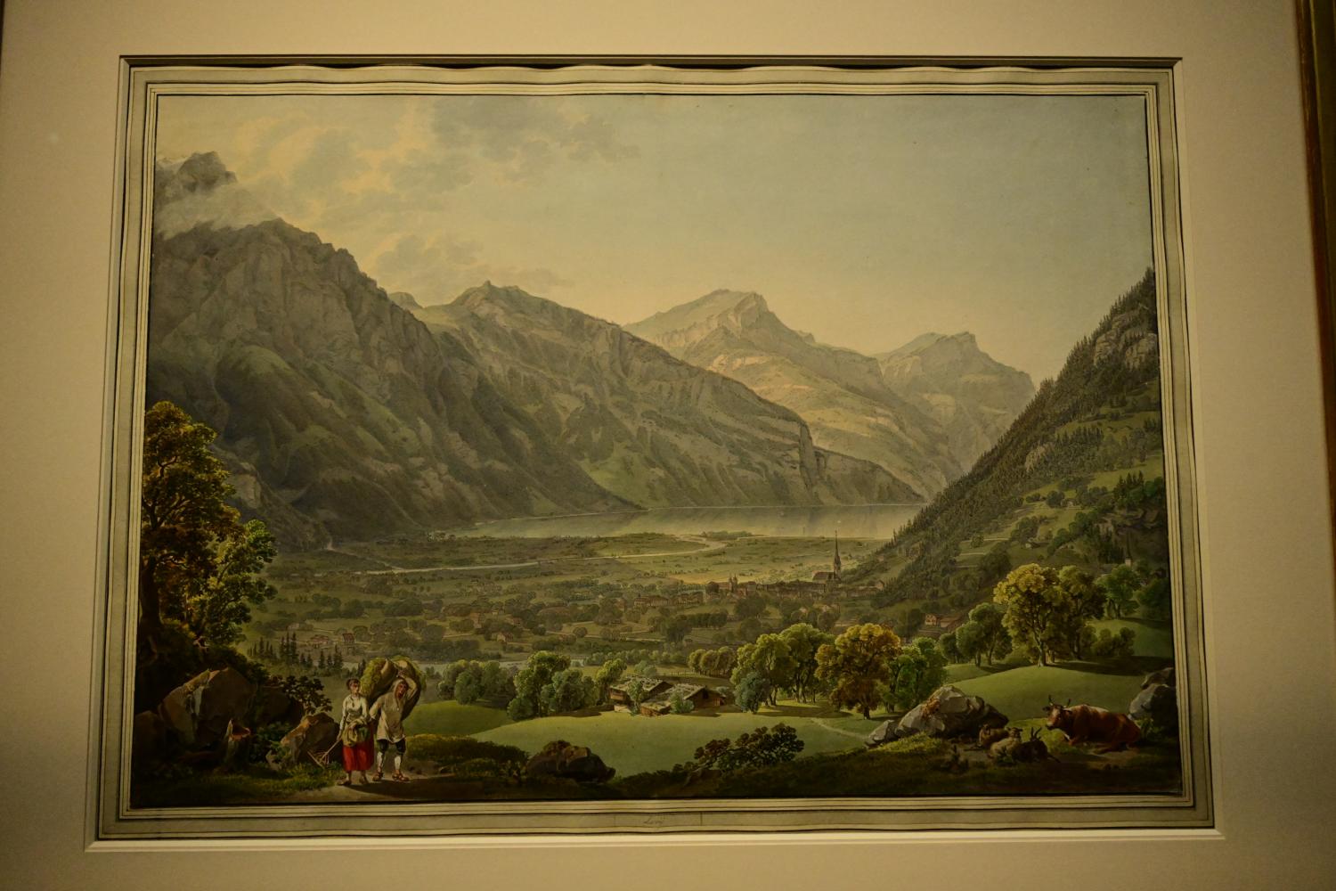 画面层次丰富:远景是巍峨雄浑的山脉,色彩从深褐到浅绿自然过渡,尽显阿尔卑斯地区山体的厚重质感;中景是开阔的卢塞恩湖与山谷间的阿尔特多夫小镇,湖面澄澈似镜,小镇建筑错落有致,教堂尖顶等元素清晰可辨,传递出人文聚落的宁静;近景则是绿意盎然的草地、树木,还有劳作或行走的人物、休憩的牲畜,为画面注入生活气息。