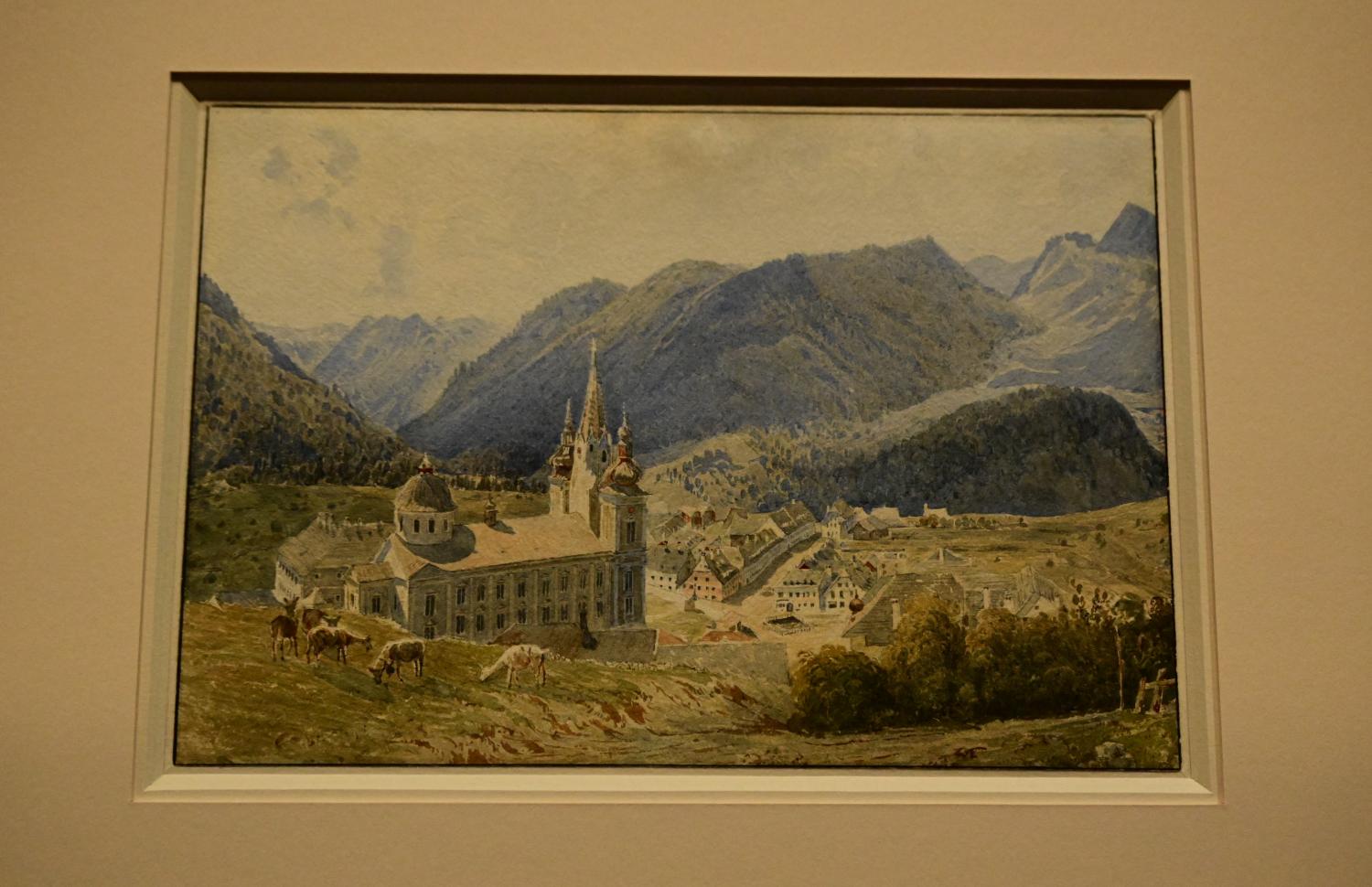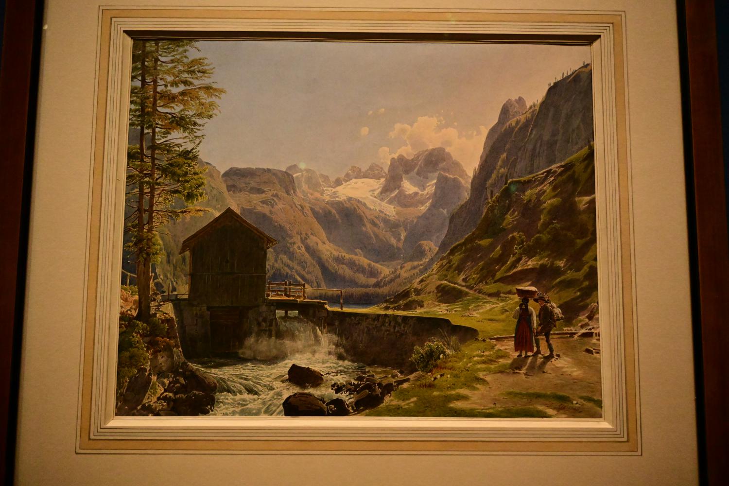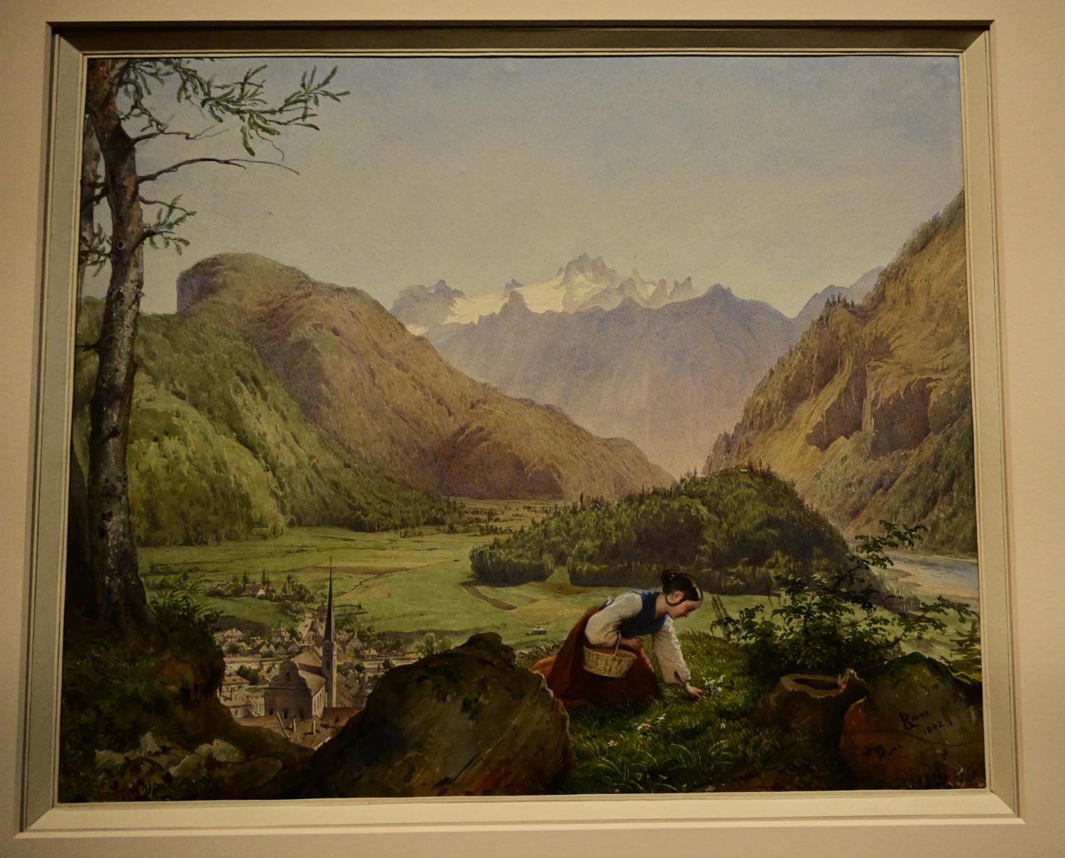 画面层次丰富:远景是巍峨雄浑的山脉,色彩从深褐到浅绿自然过渡,尽显阿尔卑斯地区山体的厚重质感;中景是开阔的卢塞恩湖与山谷间的阿尔特多夫小镇,湖面澄澈似镜,小镇建筑错落有致,教堂尖顶等元素清晰可辨,传递出人文聚落的宁静;近景则是绿意盎然的草地、树木,还有劳作或行走的人物、休憩的牲畜,为画面注入生活气息。
