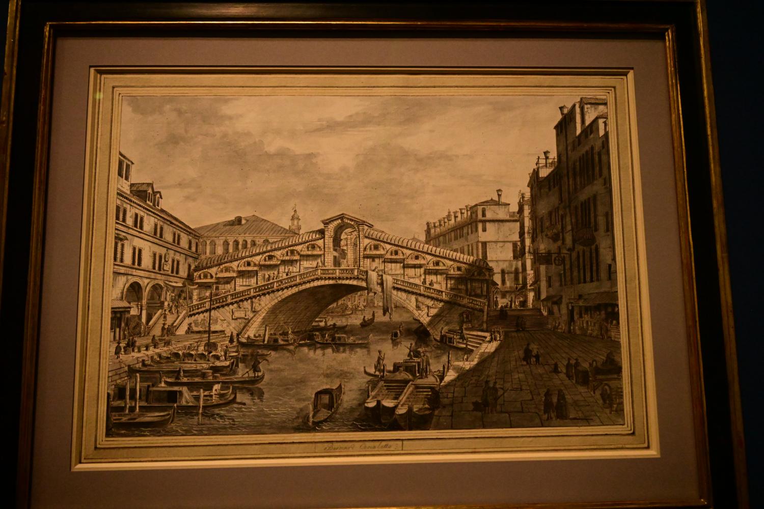 画面核心聚焦威尼斯标志性的里亚托桥:桥梁建筑细节被细致刻画,拱形桥身的结构、桥两侧错落的商铺与古典建筑轮廓清晰,尽显历史厚重感;桥下的大运河中,各类船只往来穿梭,还原了威尼斯以水为街的交通与生活场景;沿岸建筑错落排布,街道上还有行人活动,生动传递出18世纪威尼斯的市井活力。