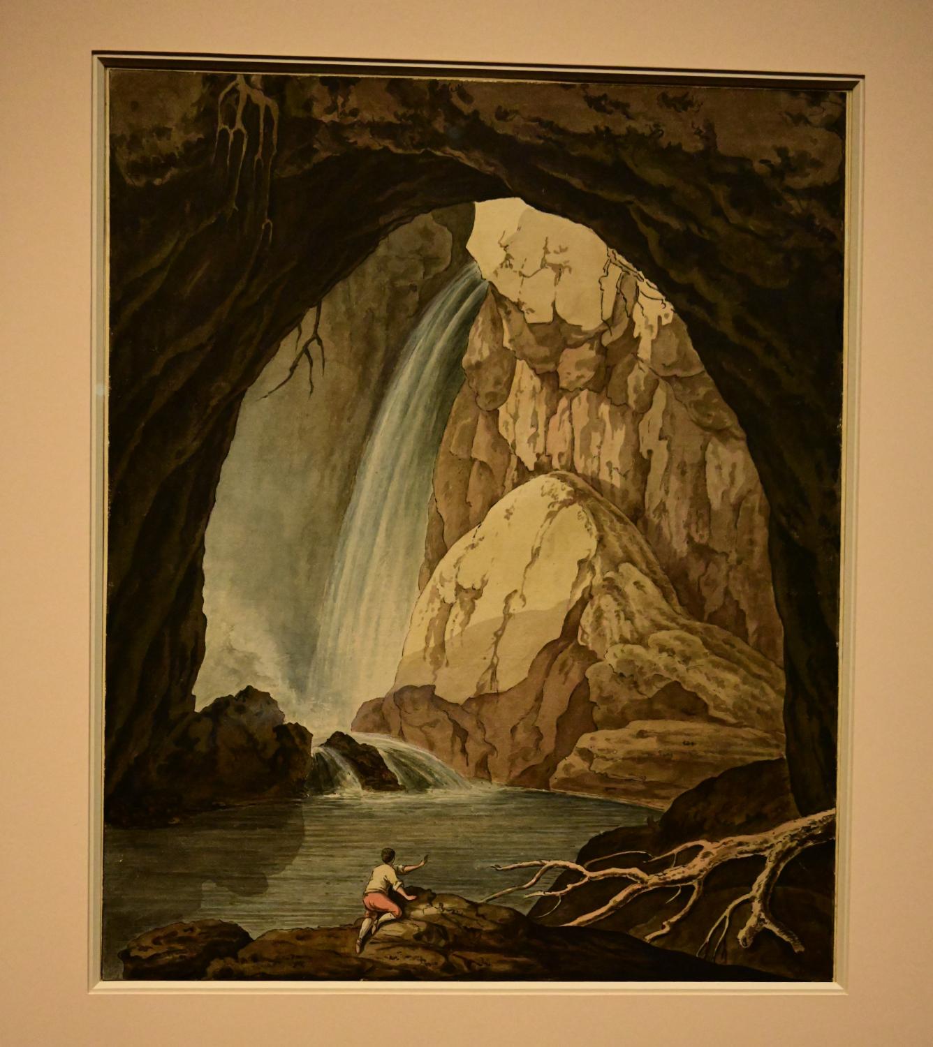 蒂沃利是意大利著名小镇,以古典遗迹与自然景观闻名;海王星洞穴关联罗马神话海神中的尼普顿,这类创作体现了 19 世纪欧洲壮游(Grand Tour)文化(贵族、文人前往意大利领略古典艺术与自然之美)下,对意大利古典遗迹与自然交融景致的视觉记录。