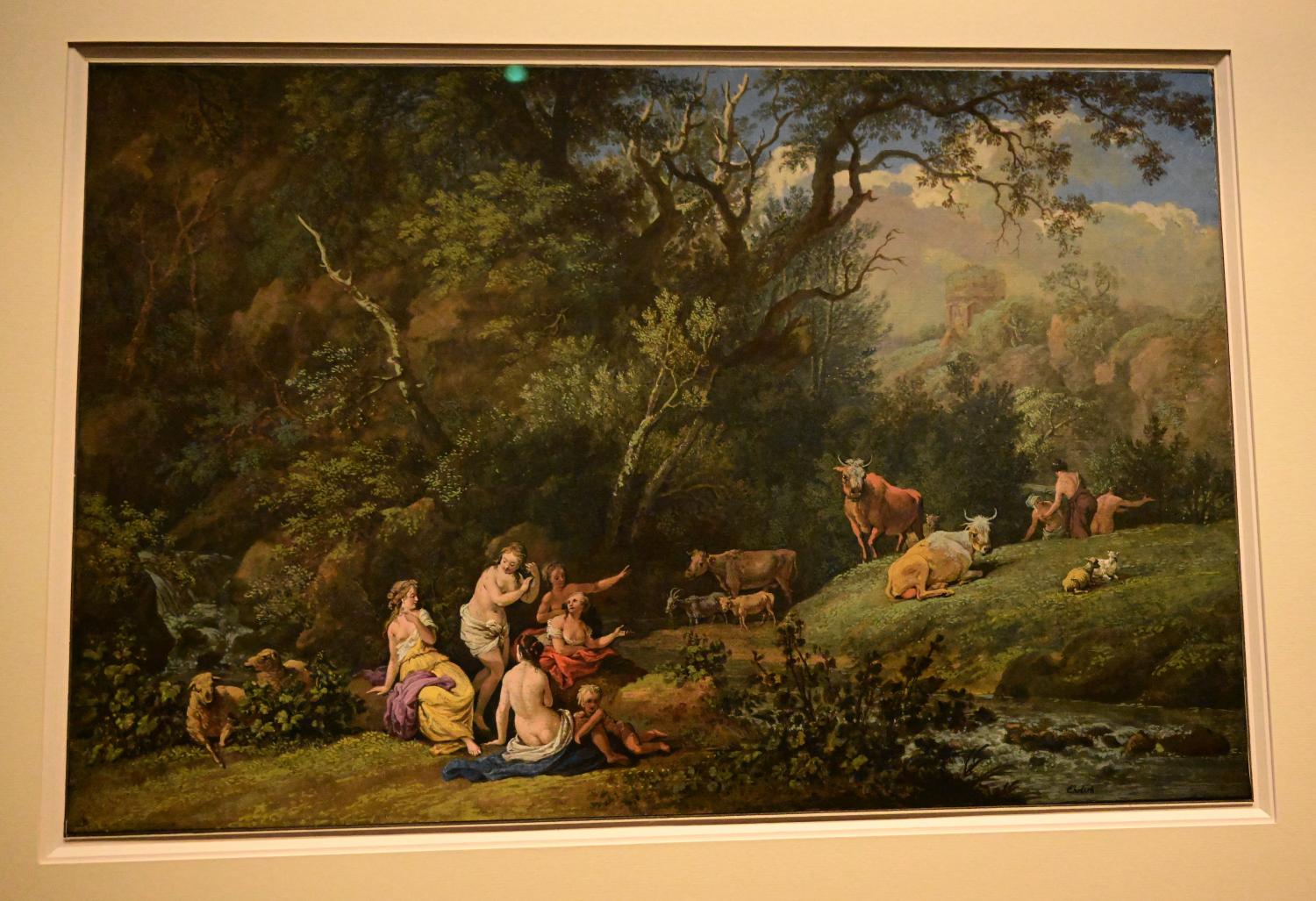 阿卡迪亚是西方艺术中象征田园牧歌式理想世界的经典意象,宁芙(Nymphs)则是希腊神话里栖居自然的精灵。画面构建出充满诗意的自然场景:茂密的森林、潺潺溪流、青翠草地交织,营造出宁静无扰的氛围;前景中,几位宁芙或休憩、或互动,身旁还有孩童与羊、牛等动物相伴,仿佛刚结束沐浴,在自然里享受悠闲时光;背景的树木与远处隐约的建筑遗迹,进一步强化了远离尘世喧嚣的理想田园的 质感。
