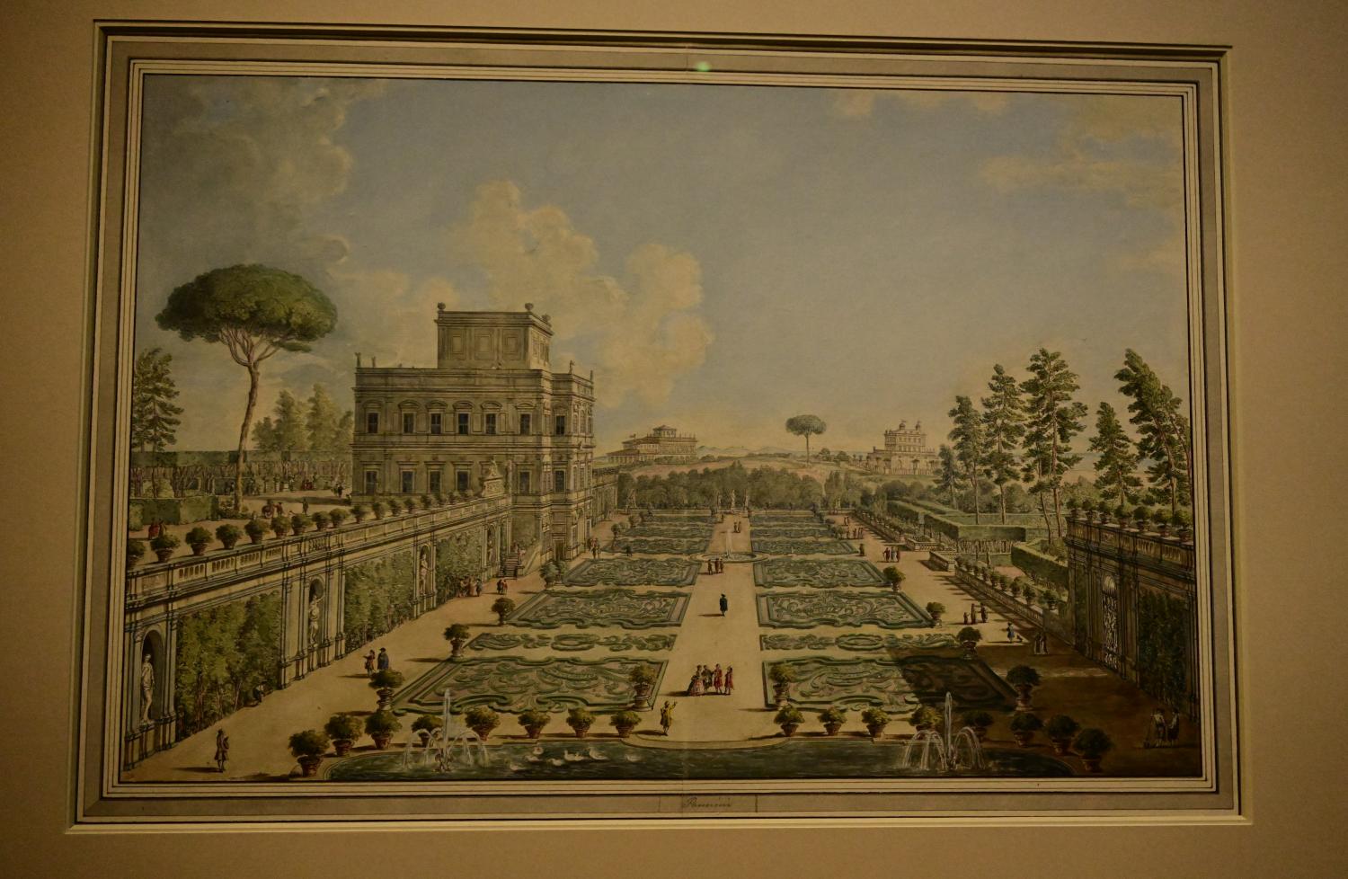 技法上,轮廓雕刻精准勾勒出建筑、园林的结构线条,让建筑立面、园林纹饰等细节清晰立体;水彩晕染则赋予画面柔和的色彩层次,使建筑的石材质感、园林的绿意生机与天空的澄澈色调浑然一体。作品不仅是对18世纪罗马著名贵族庄园的写实记录,更通过艺术化的呈现,传递出对古典建筑美学与园林秩序之美的推崇,生动定格了当时罗马贵族生活与园林艺术的风貌。