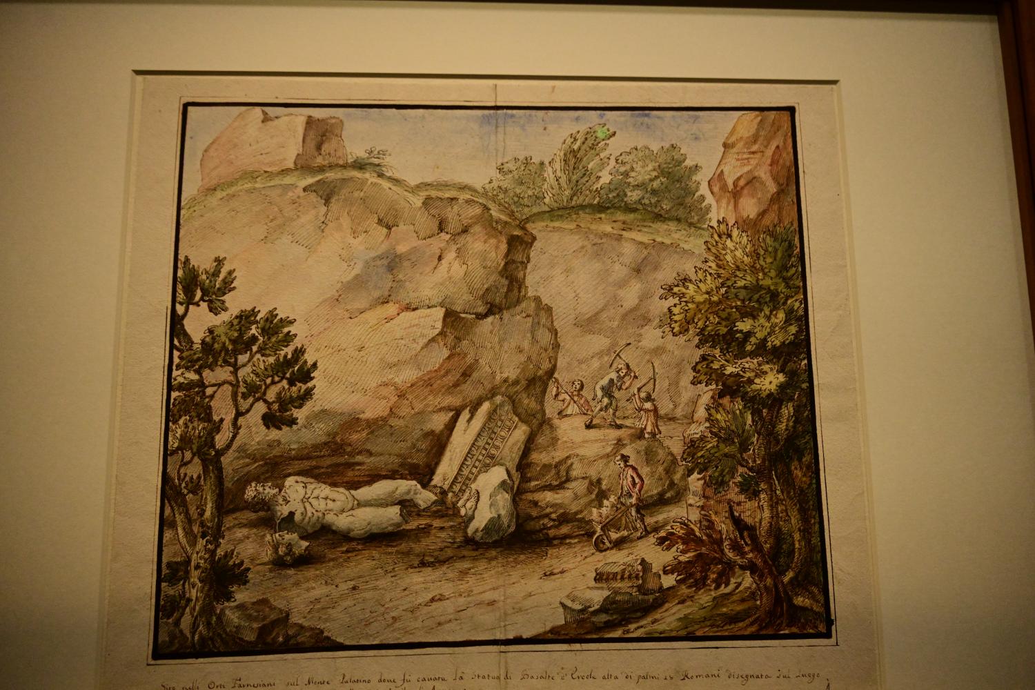 画面聚焦罗马帕拉蒂尼山的考古发掘现场:岩石与树木环绕的山地间,散落着古罗马雕塑残躯,如左侧大型人体雕像残件、刻有纹饰的建筑构件;几位人物正在劳作,有的挥舞工具挖掘,有的搬运物品,生动还原了18世纪初考古发掘的动态场景。