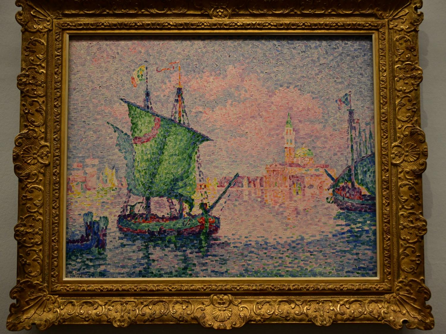 作为新印象派的核心艺术家,西涅克以细密色点并置的技法构建画面:画中呈现威尼斯的水上景致,绿色帆船、波光粼粼的水面,以及远处带有穹顶与尖塔的威尼斯标志性的圣乔治马焦雷教堂建筑,都由无数鲜亮的小色点交织而成。粉色云朵晕染天空,与水、建筑、船只的蓝绿粉等色彩呼应,既借点彩技法让色彩在视觉中自然混合,保留了鲜亮感,又精准捕捉到威尼斯在柔和光线里的梦幻氛围,尽显新印象派对色彩与光学原理的探索,也传递出水城独有的浪漫诗意。