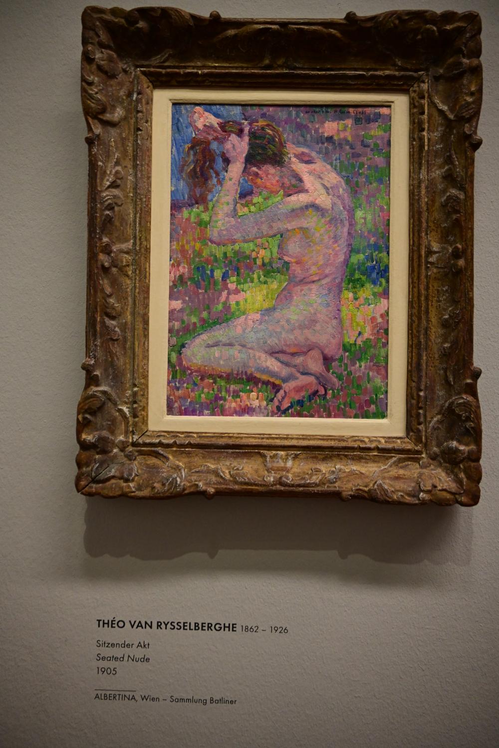 泰奥・凡・里斯尔伯格是新印象派的重要艺术家,这幅画以细密色点并置的技法创作:画面聚焦一位坐姿的裸体女性,她抬手梳理头发的姿态优雅柔和;人物躯体与背景的草地、环境,都由无数鲜亮且富有层次的小色点交织而成,绿、紫、粉等色彩在视觉中自然融合,既精准捕捉人体的形态与动态,又借新印象派对色彩光学的探索,营造出柔和、富有韵律的氛围,让人体与自然背景在色彩与光影的交互中达成和谐,是新印象派人体题材创作的典型代表。