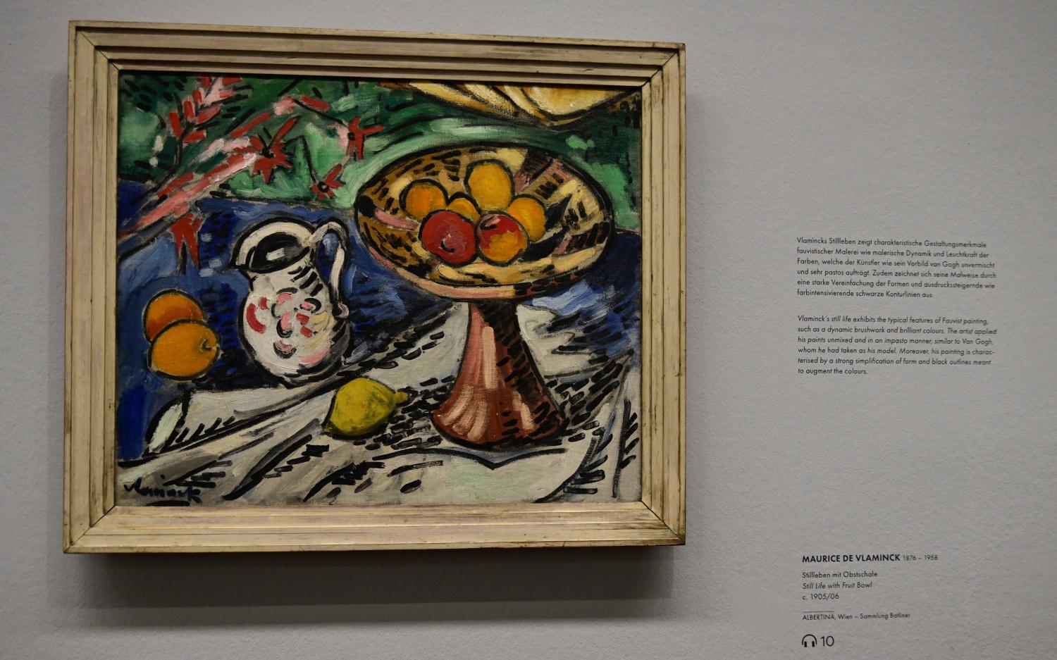 作为野兽派的核心艺术家,弗拉曼克在这幅画中尽显野兽派的艺术特质:色彩大胆浓烈,蓝、绿、红、黄等色彩未经过多调和便直接铺陈,笔触充满动感与力量,带有凡・高式的厚涂质感;同时,又以简化的形态与醒目的黑色轮廓线强化画面,让果盘、水罐、水果与背景在强烈的色彩对比、富有张力的笔触中,传递出蓬勃的生命力,突破了传统写实静物的束缚,以色彩与线条的冲击,彰显野兽派借极致色彩表达情感的创作追求。