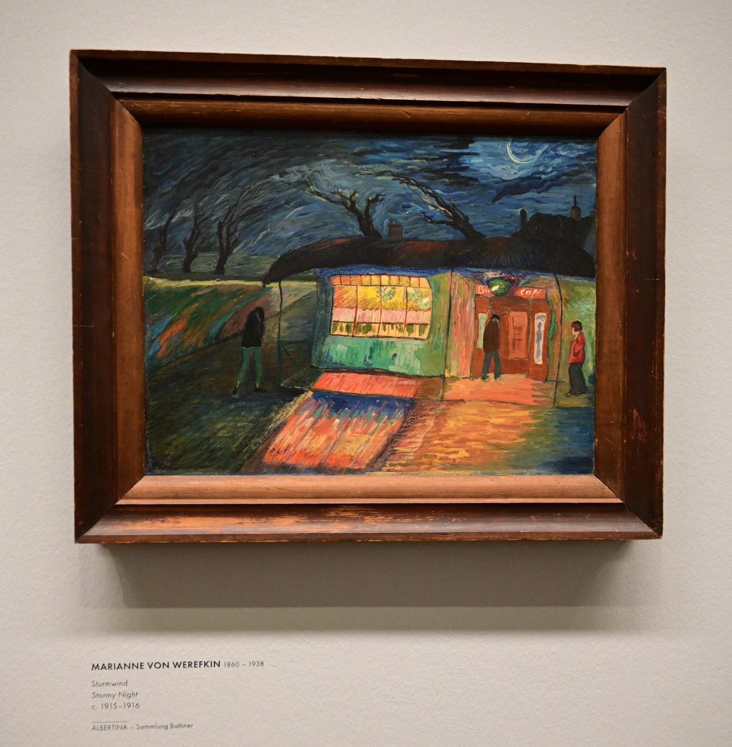韦雷夫金以粗犷奔放的笔触、鲜明主观的色彩对比,既传递出暴风夜的动荡与压迫感,又借暖光咖啡馆营造出人间的温暖静谧,让自然的狂暴与人间的安宁形成富有张力的视觉对话,尽显表现主义以艺术传递情感与精神氛围的创作特质。