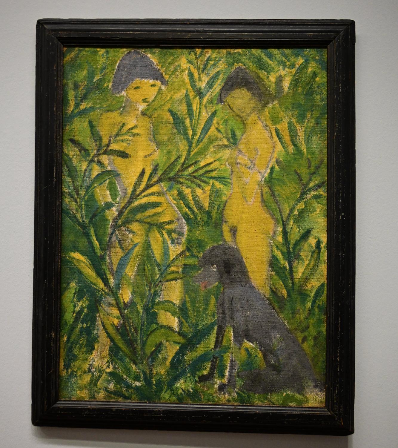 奥托・穆勒是表现主义团体桥社的核心艺术家,这幅画尽显其创作特质:画面以柔和的黄色塑造两位女性躯体,繁茂的绿色铺陈植物,色彩主观且富有韵律;人物与贵宾犬的形态被简化,带有平面化的装饰感,却在简洁轮廓中传递出宁静诗意。穆勒借人与自然的交融场景,以温润色彩与抒情性的造型,营造出质朴又充满梦幻感的氛围,体现了表现主义以艺术传递情感与精神联结的追求。
