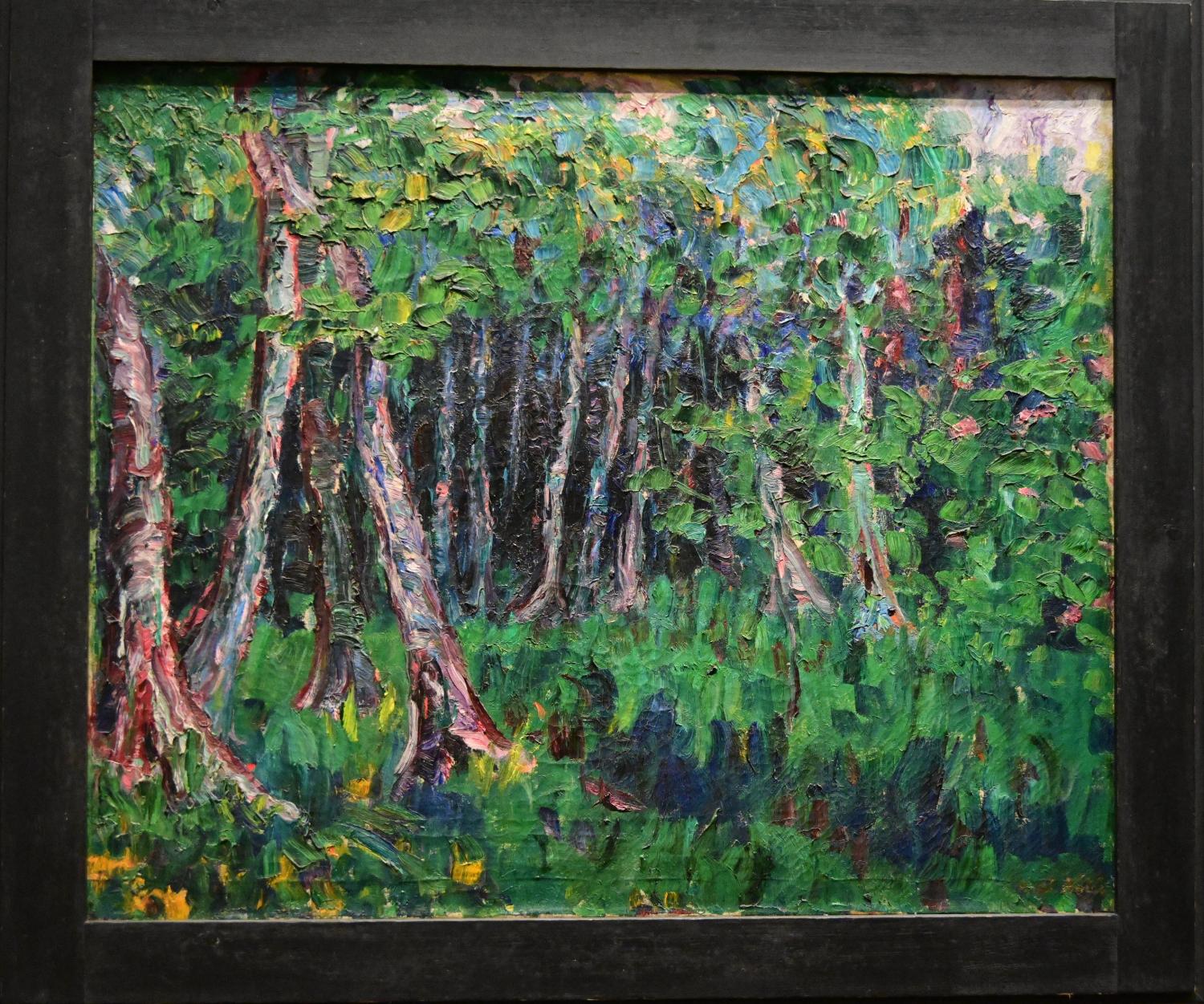 作为表现主义的核心艺术家,诺尔德以极具张力的笔触与主观化的色彩,重构了森林的视觉形态:画面中,繁茂的植被与树干被厚重、富有肌理的绿色(交织着蓝、紫、红等色调)所覆盖,笔触奔放且充满动感,并非对森林的写实描摹,而是借色彩与笔触的碰撞,传递出自然本身的蓬勃生机与原始力量,尽显表现主义以艺术抒发内心情感、强化视觉冲击力的创作特质,让观者能直观感受到森林在光影与色彩交融中涌动的生命力。