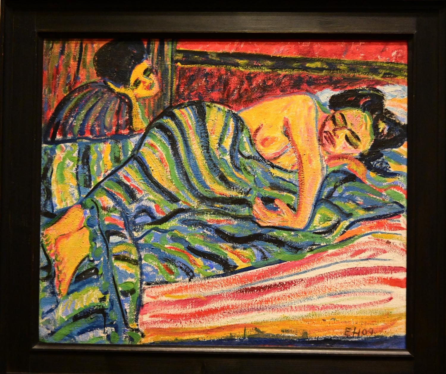 作为表现主义团体桥社的核心艺术家,赫克尔在这幅画中尽显表现主义的创作特质:色彩大胆浓烈,红、黄、绿、蓝等色调未经克制地碰撞交织;人物与布料的形态经主观提炼,以富有动感的笔触与夸张的色彩对比,打破传统写实的束缚。画面里,斜倚的女性被多彩织物环绕,背景的浓烈色彩与人物造型相融,既传递出人体的柔和姿态,又借强烈的视觉张力,抒发内心对生命与情感的主观体悟,是表现主义以艺术强化精神表达的典型创作。