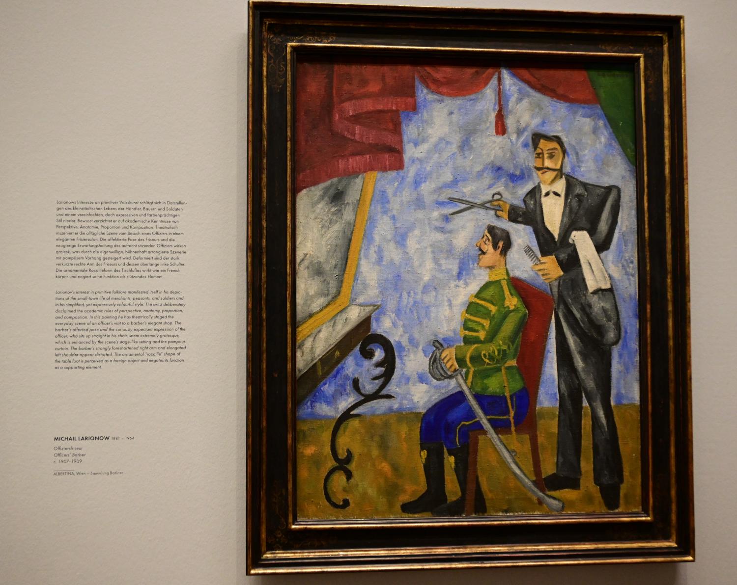 拉里奥诺夫受民间艺术启发,以新原始主义的创作思路,简化形态却强化色彩张力,将日常理发场景营造成类似舞台戏剧的画面。华丽的帘幕、夸张的人物姿态,既展现生活切片,又通过对传统艺术规范的突破,传递出早期现代艺术的实验性,让普通场景充满视觉冲击力与艺术革新的精神。