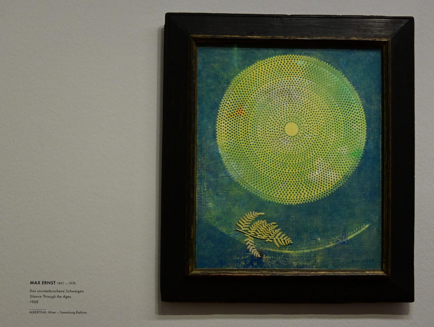作为超现实主义的核心艺术家,恩斯特借助混合技法探索潜意识与梦幻感。画面中,深蓝色背景烘托出静谧氛围,带有点阵纹理的亮黄色圆形似神秘天体,与下方蕨类植物造型形成视觉对话。冷蓝与暖黄的色彩碰撞,既营造出宇宙般的幽远感,又凭借蕨类的远古自然质感,传递出跨越时间的沉默与永恒,尽显超现实主义对自然神秘性、时间维度及潜意识的挖掘。
