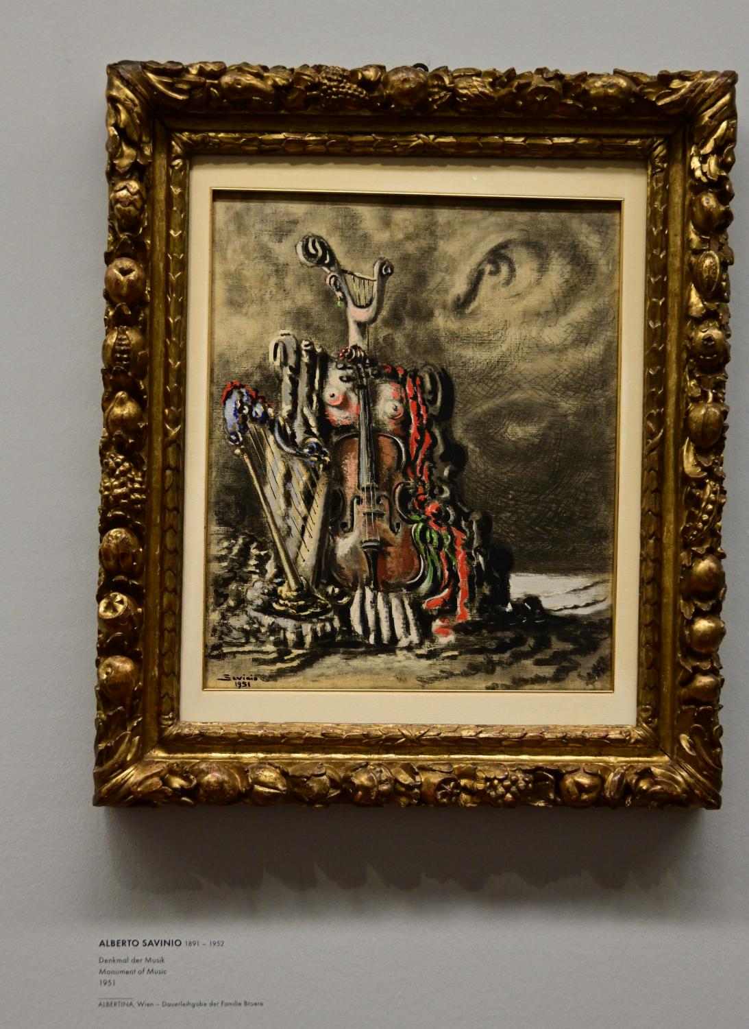 作为意大利现代艺术与文学领域的创作者,萨维尼奥以超现实与象征手法,将小提琴、竖琴等乐器、人体形态与背景的巨眼等神秘符号交织融合。画面中,深色背景烘托出神秘氛围,乐器与人体元素的变形、拼贴,让音乐纪念碑超越了具象的乐器描摹,成为对音乐永恒性与精神力量的视觉礼赞,也体现了超现实主义对潜意识与象征符号的探索,传递出对音乐艺术的崇高致敬。