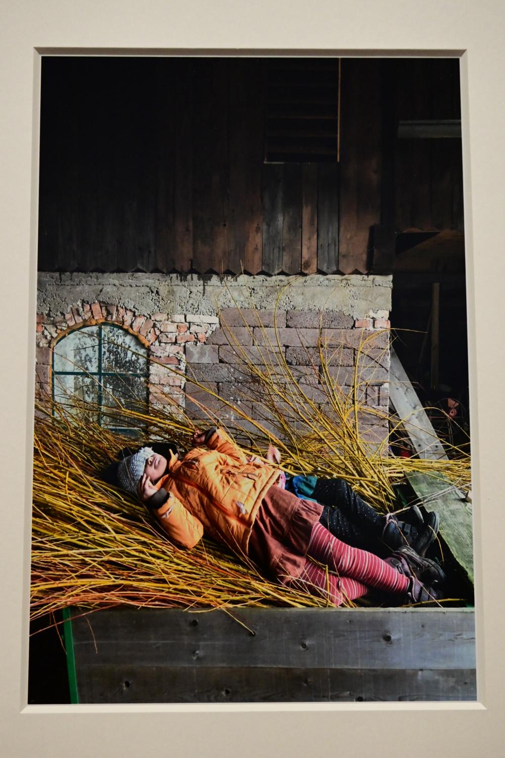 这幅摄影作品定格了充满生活诗意的瞬间:画面中,孩子穿着亮橙色外套、条纹裤,放松地躺卧在明黄色的植物间,背景是斑驳的砖石与木质建筑。