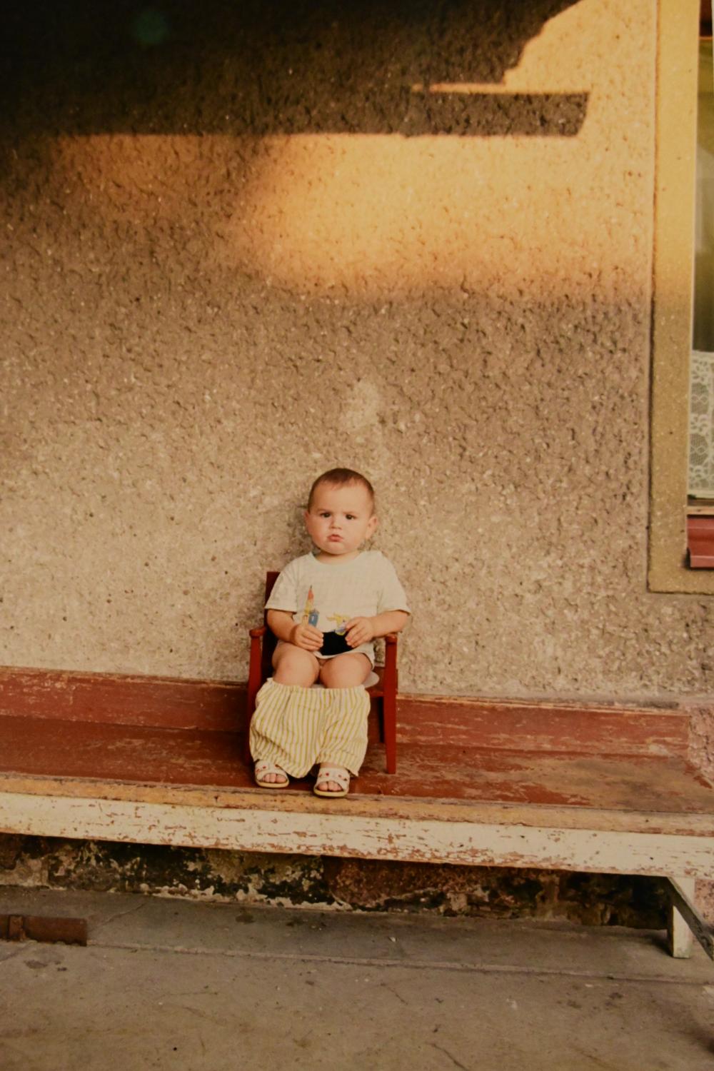 这幅作品捕捉了充满生活质感与童真的瞬间:孩童坐在小巧的红椅子上,裤子松垮地褪至脚踝,身着印有趣味图案的T恤,脚蹬凉鞋;背景是粗糙斑驳的墙面,暖柔的光线在墙面上晕开,搭配老旧且漆面剥落的木质平台,整体氛围质朴而温暖。画面既展现出孩童天真懵懂的状态,又借由复古质感的环境,传递出一种怀旧的日常温情,仿佛将平凡生活里的童真片段,凝练成充满记忆感的影像。
