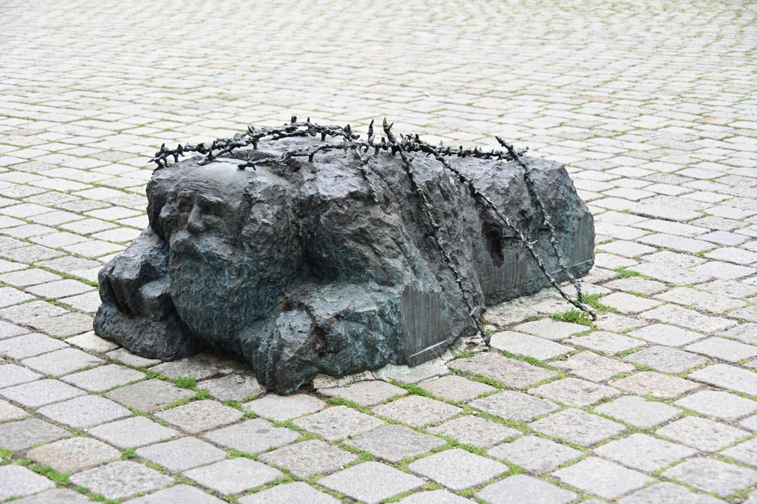 雕塑下方的地面还有绿黑相间的大石,石上缠绕的元素象征着犹太人被关进集中营惨遭屠戮残害的历史,以此传递对战争与法西斯主义的控诉和反思。