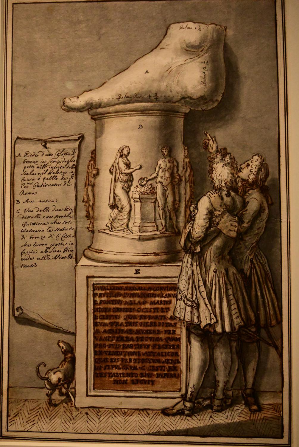 下图作品名称《罗马:巨型青铜脚》(Rome: Colossal Bronze Foot),创作于18 世纪中期,作者匿名,以钢笔、画笔与墨水在纸上绘制。