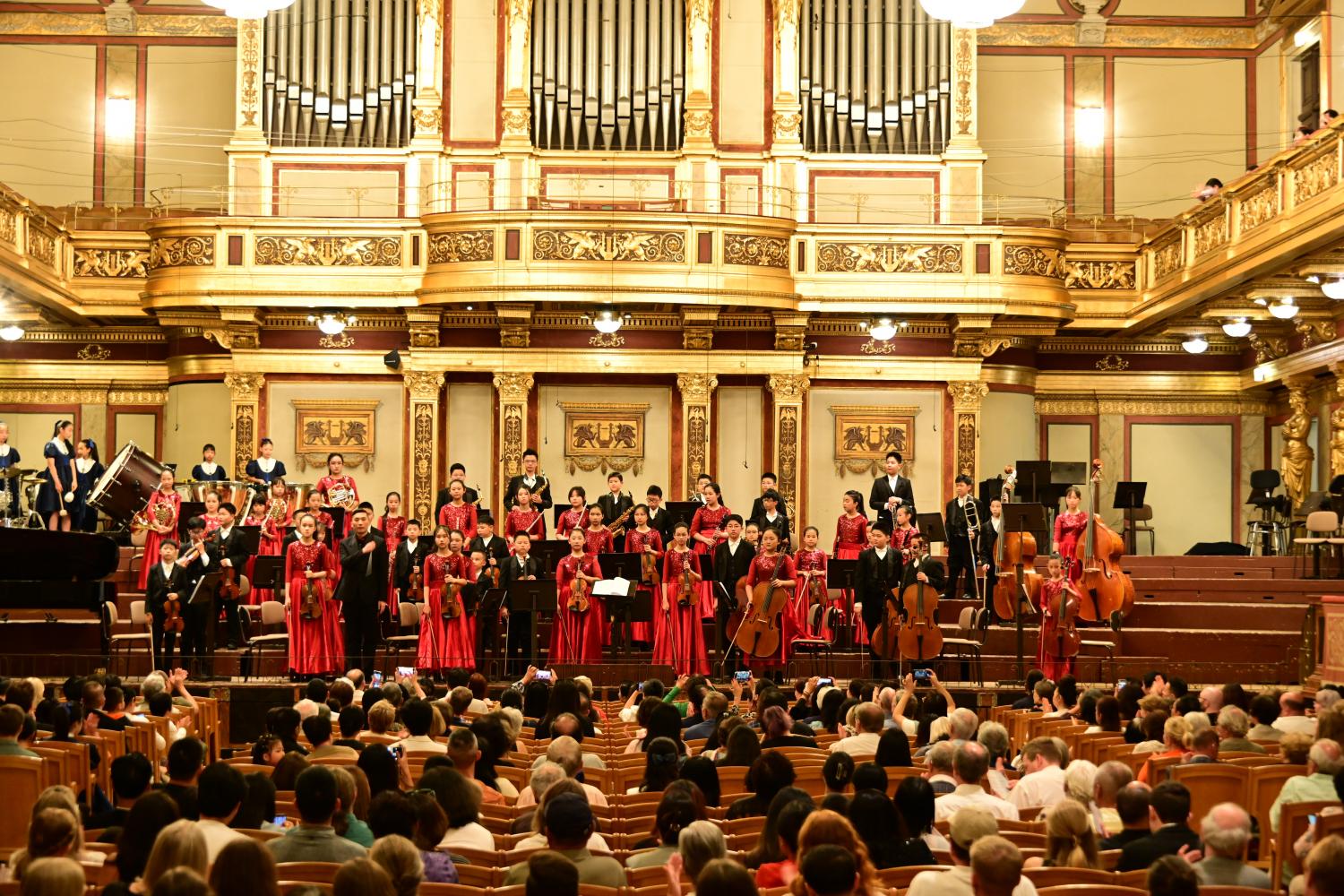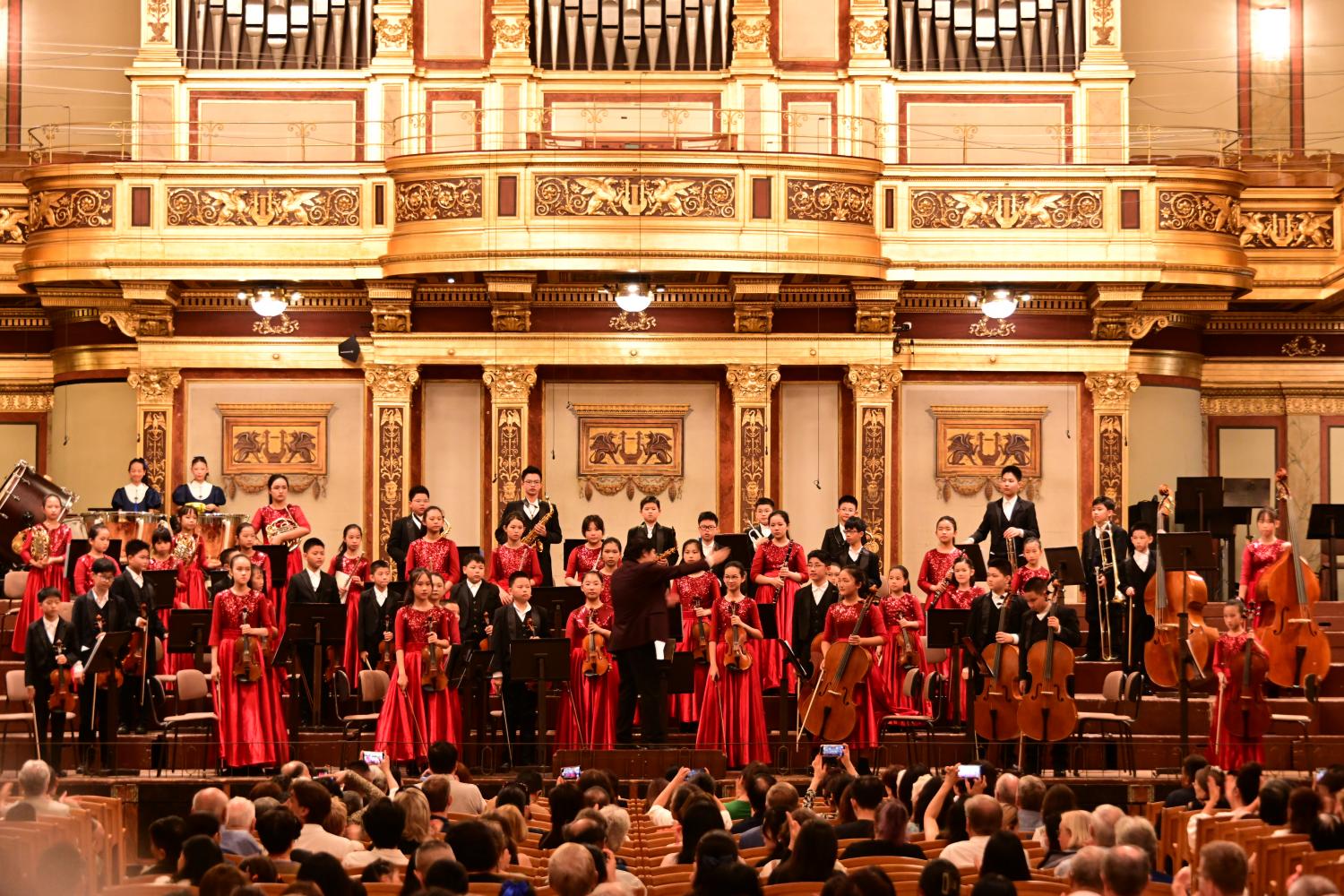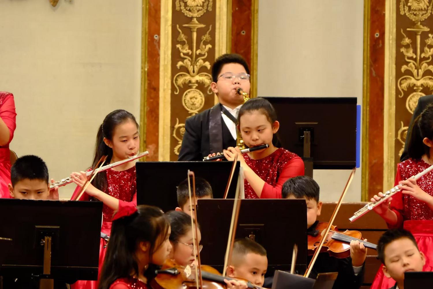 韩老师和张老师分别做为指挥,管乐团和管弦乐团,孩子们在台上的排位有所不同。