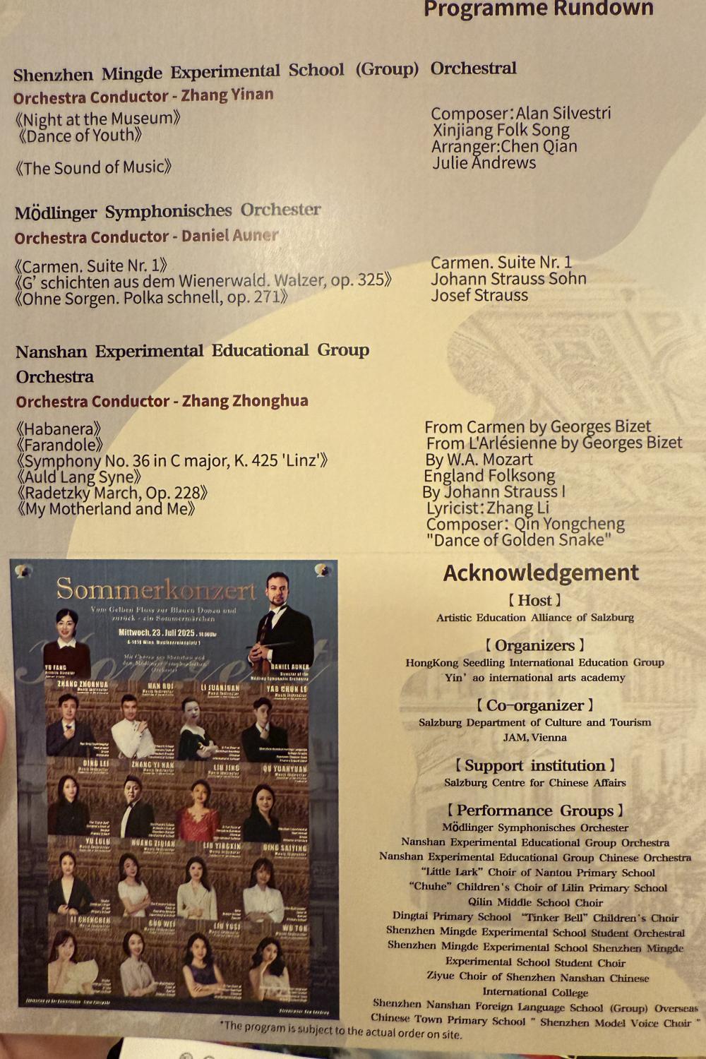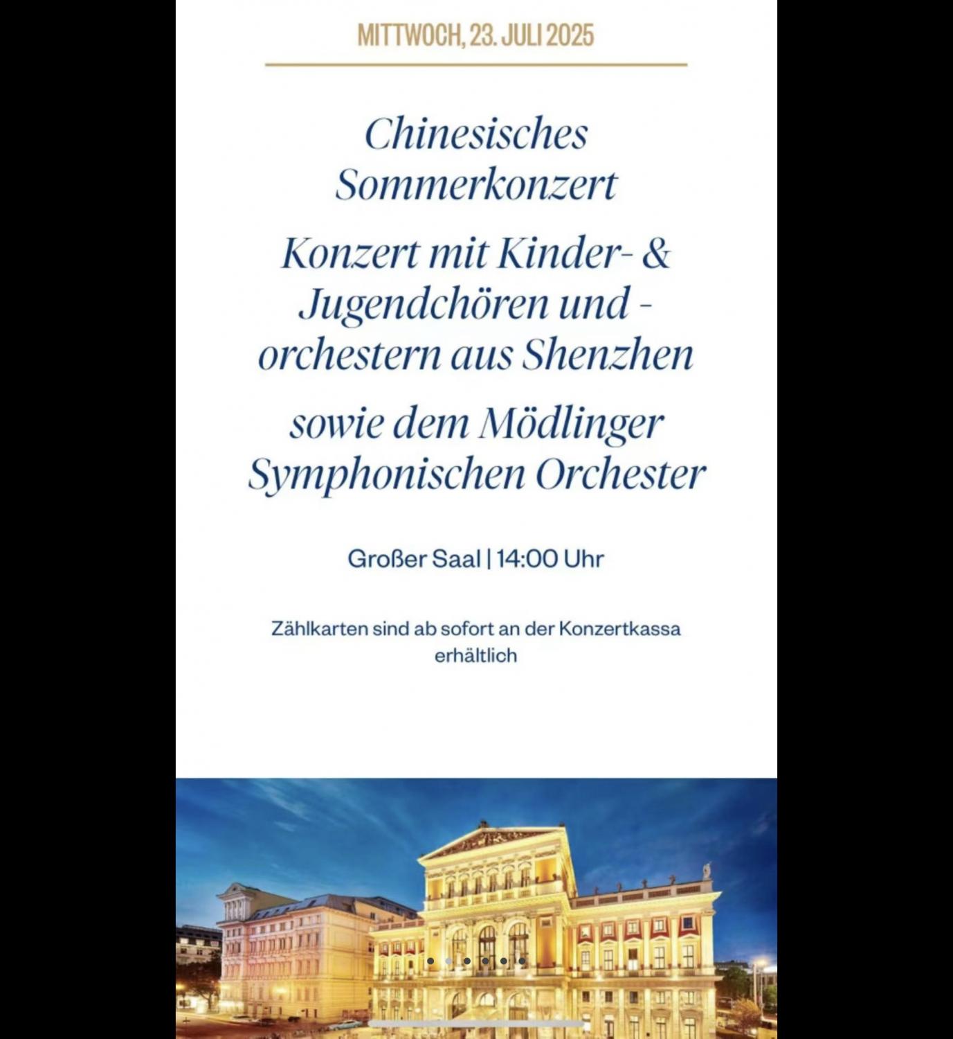 主题与演出阵容:名为 “中国夏季音乐会”,由深圳的儿童及青少年合唱团、管弦乐团,与奥地利默德林交响乐团(Mödlinger Symphonisches Orchester)共同演出。