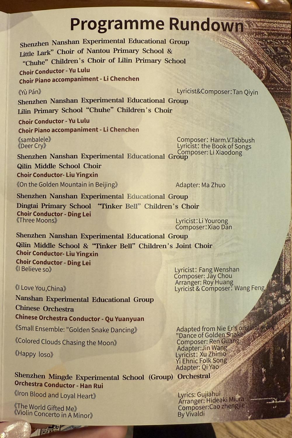 下面是详细的节目单,有来自深圳的四支队伍参与演出,分别是深圳南山中加学校、深圳南山实验教育集团、深圳南山外国语学校(集团)、深圳明德实验学校(集团)。