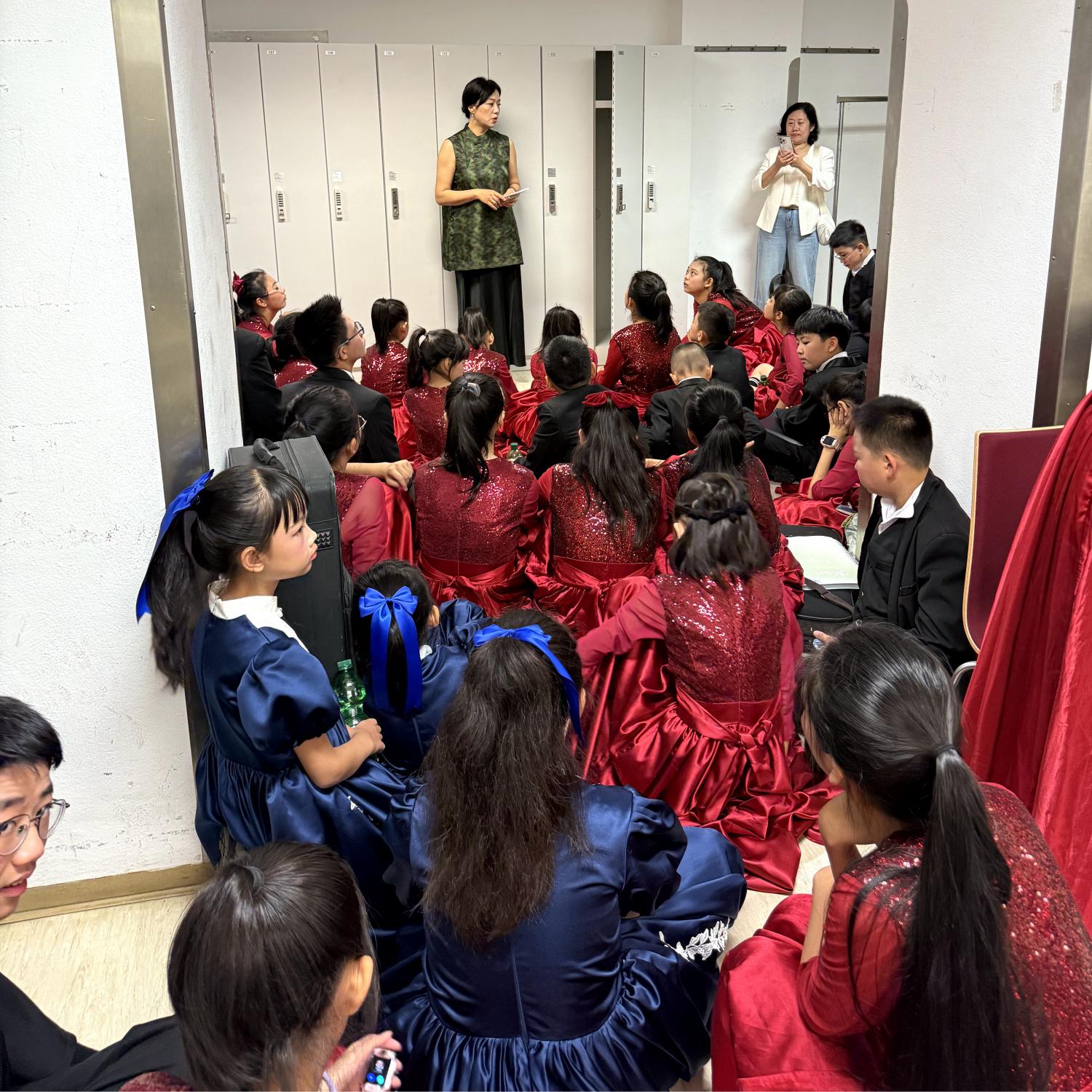 为这场演出,孩子们排练了几个月,上场前,有限的场地内,带队的副校长讲话,也是要认真听的。