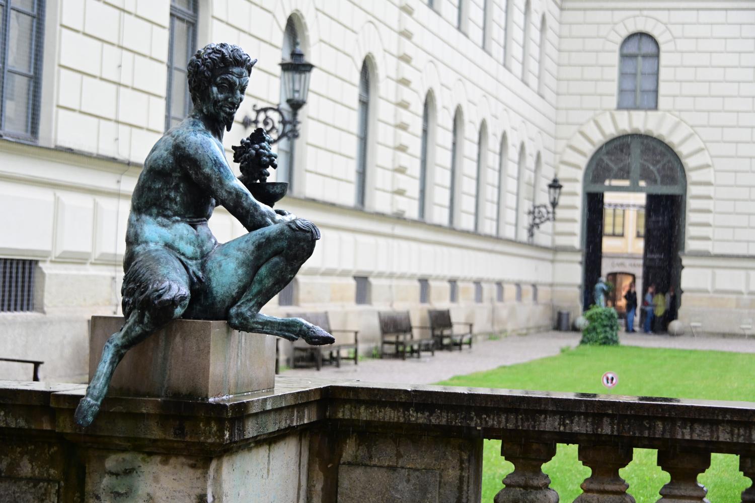 院中有几个雕塑,其中之一呈现的是半人半羊的森林之神萨堤尔的形象,这类雕塑带有古典神话色彩,与王宫的历史文化氛围及艺术陈设相呼应,展现王宫在建筑与雕塑艺术上的古典美学表达。