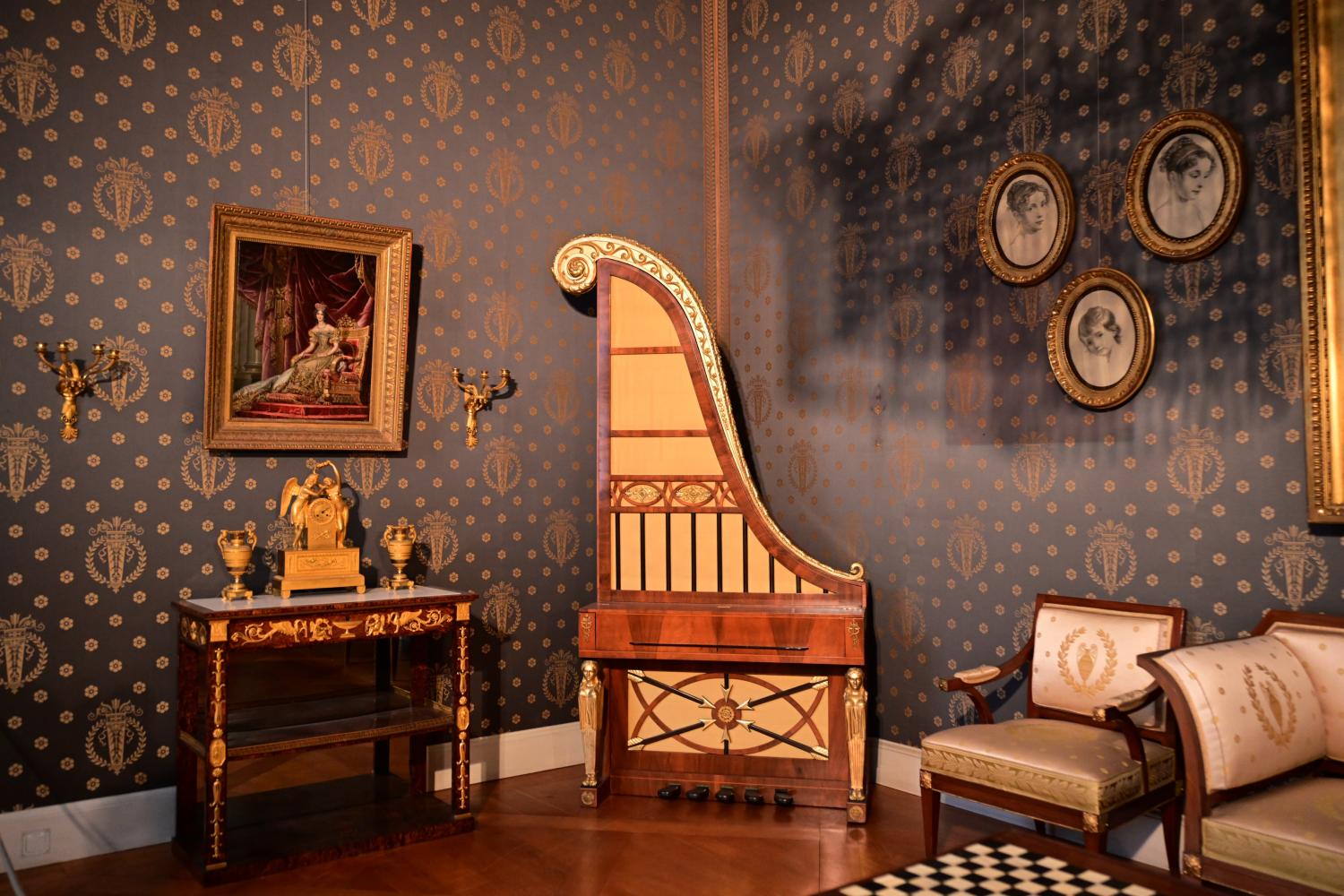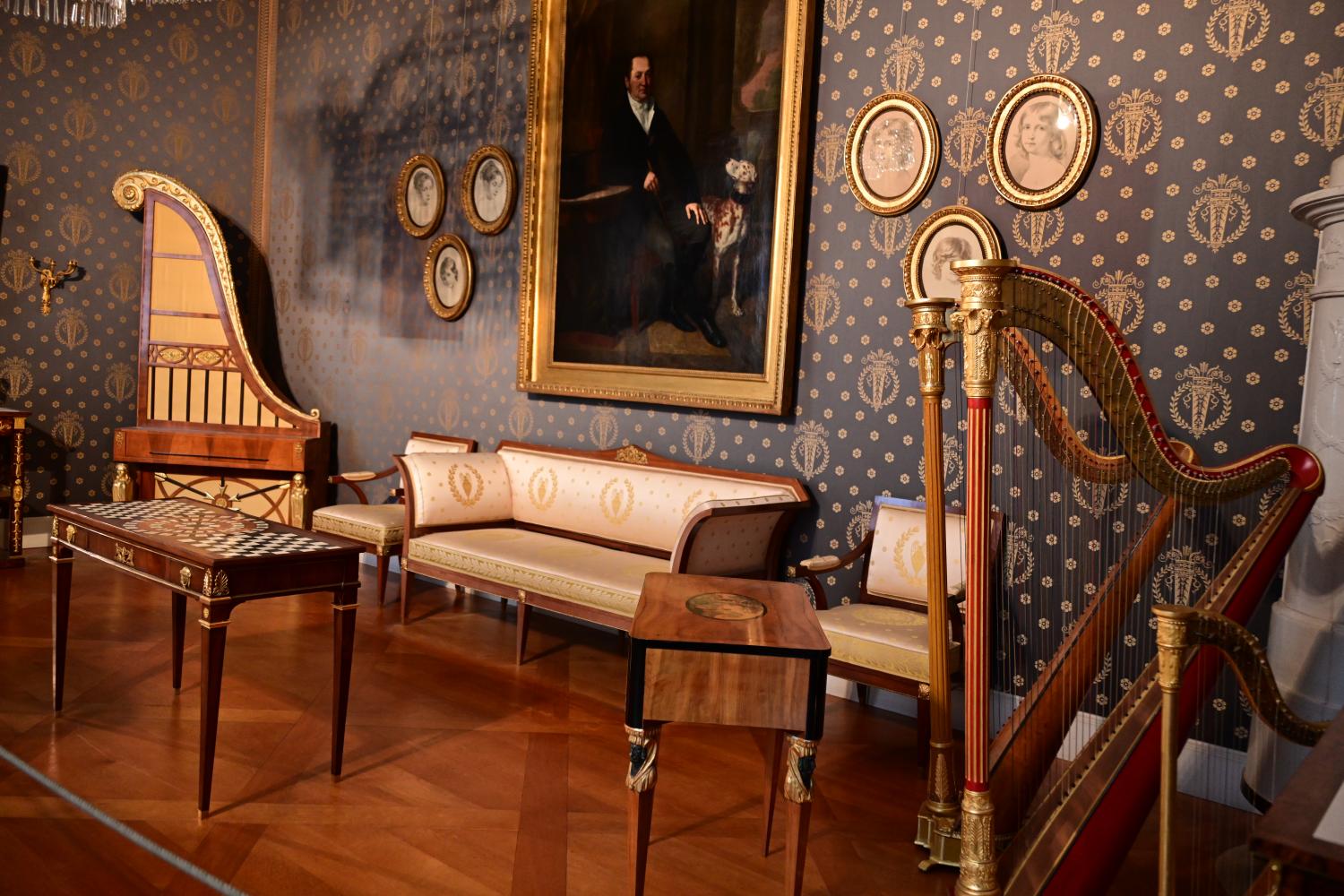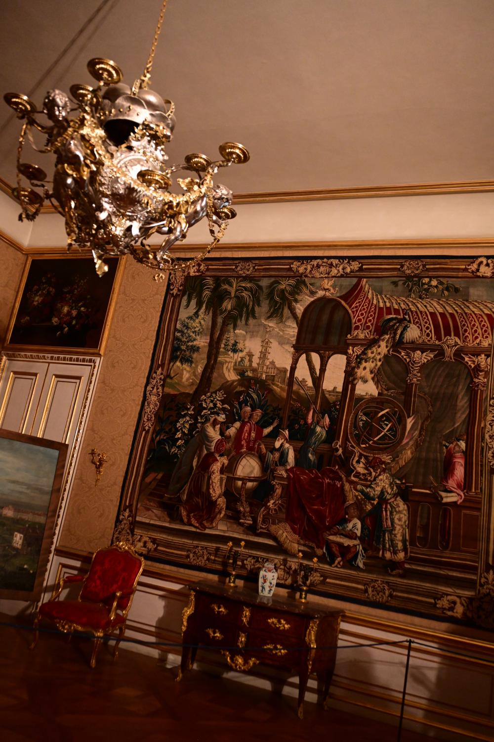 国王寝宫:位于国王殿二层,空间分为卧室与更衣室,卧室采用浅蓝色丝绸墙面,搭配白色洛可可风格家具,床品为手工刺绣的花卉图案;更衣室内设有多组胡桃木衣柜,用于存放国王的朝服与日常服饰;如今寝宫按1835年的物品清单复原,展示王室的日常生活场景。