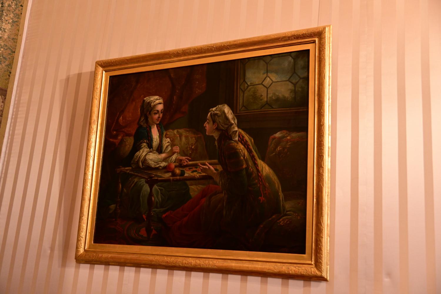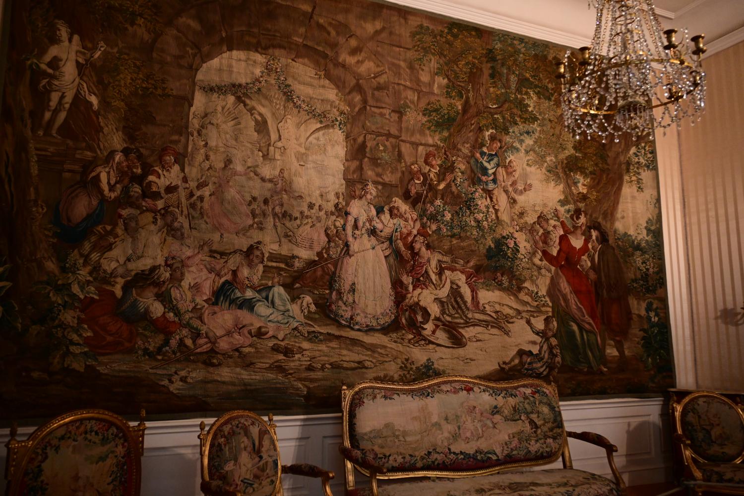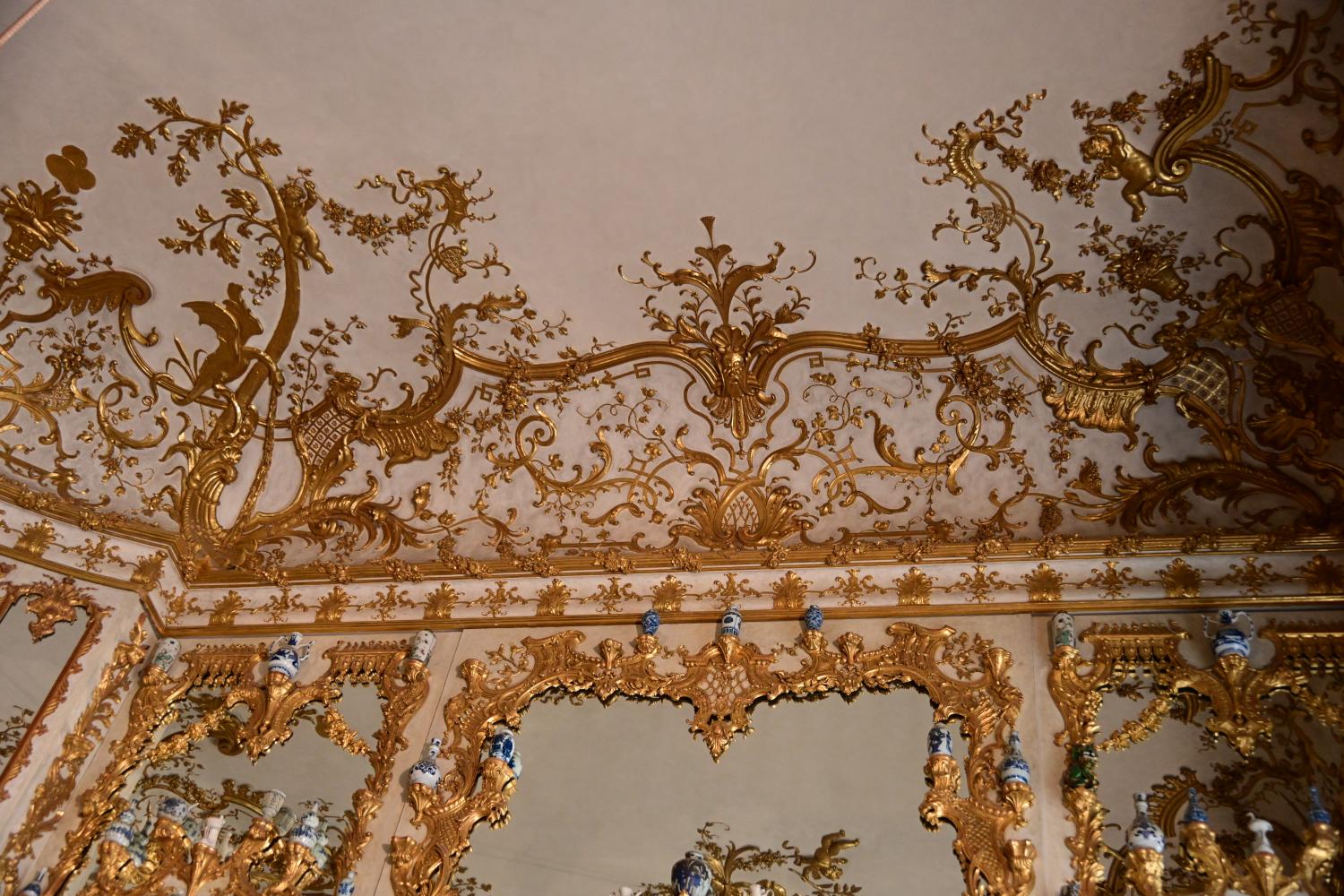 设计上属于典型的洛可可风格装饰。天花板与墙壁布满繁复精美的金色雕花,搭配带有艺术感的油画,尽显奢华精致。