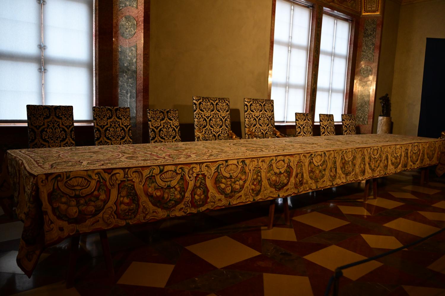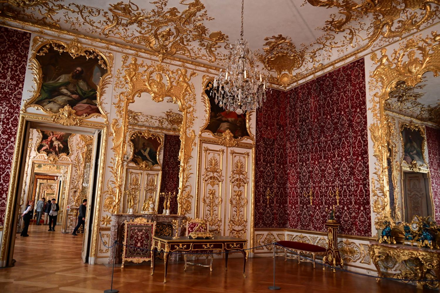 皇家议会厅:长方形空间,墙面覆盖深红色天鹅绒挂毯,挂毯绣有巴伐利亚王国的疆域地图;厅内设有16把胡桃木座椅,对应王室成员与政府高官的席位,中央为国王宝座,宝座采用镀金工艺与皮革装饰,上方悬挂巴伐利亚王国国徽;1918年王朝终结前,这里是巴伐利亚王室召开政务会议的场所。