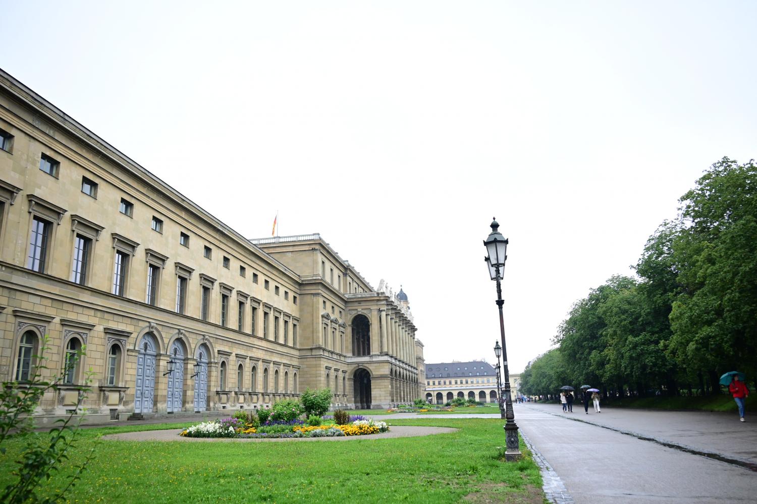 先从停车的马克斯-约瑟夫广场看起吧,这是慕尼黑市中心的一处大型广场,得名于巴伐利亚国王马克西米利安一世・约瑟夫,周边有许多著名建筑, 就包括下图居中的慕尼黑国家剧院,始建于1811年,是一座历史悠久的歌剧院,是巴伐利亚国家歌剧院、巴伐利亚国家管弦乐团和巴伐利亚国家芭蕾舞团的主场。