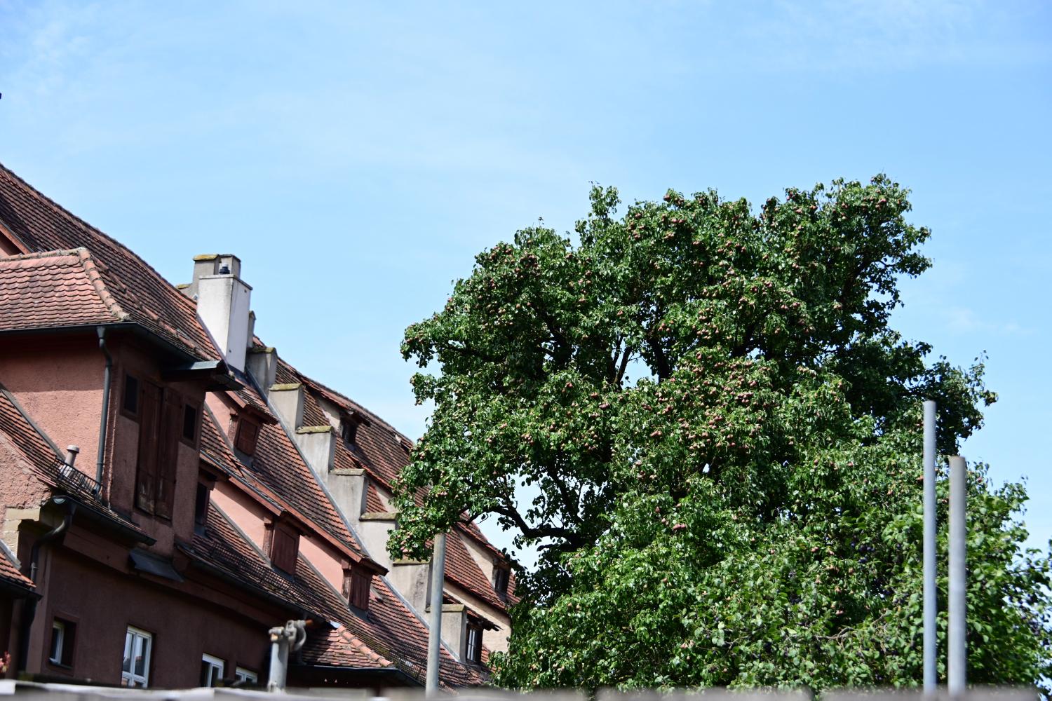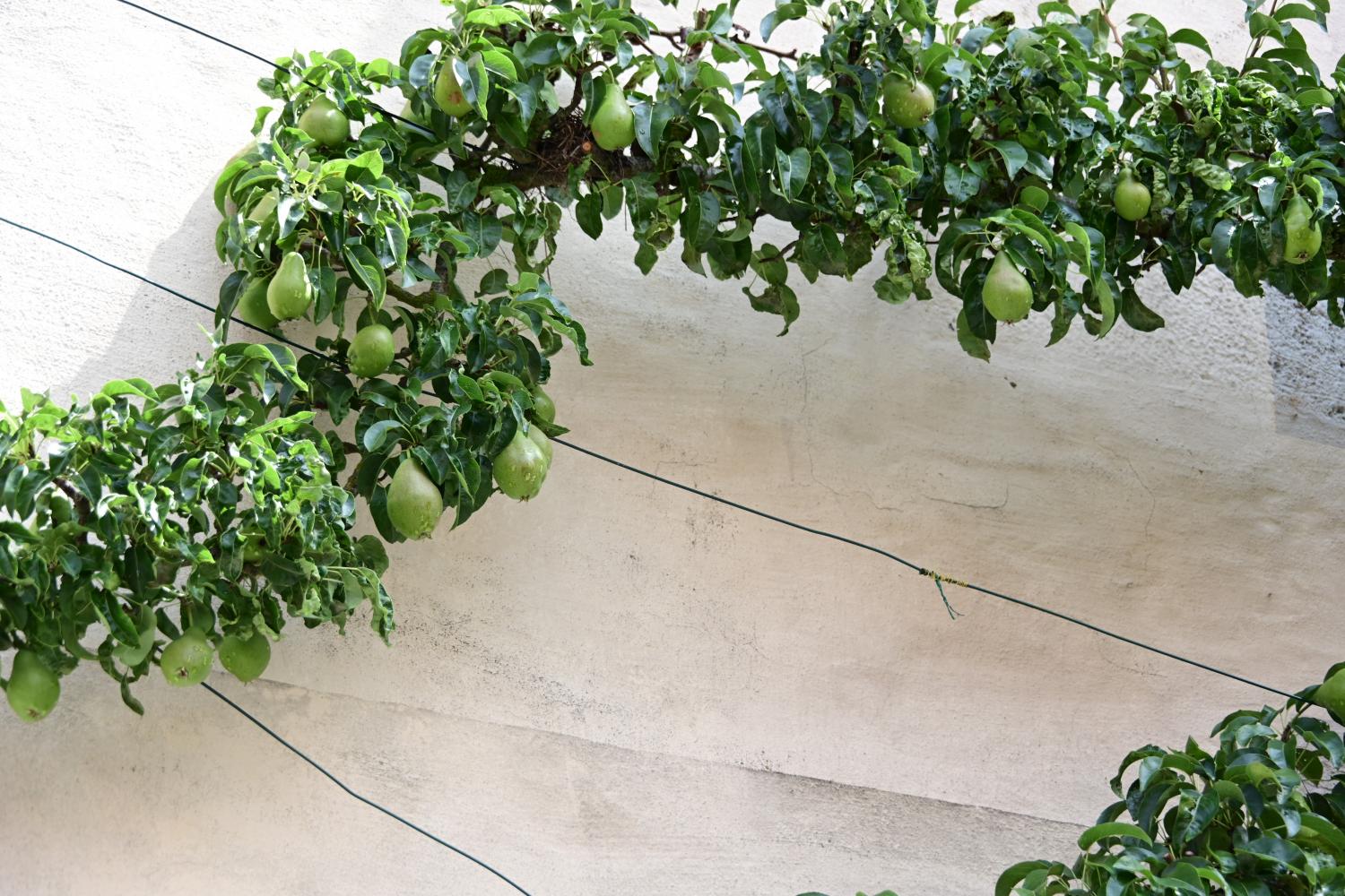 又看到被打扁了的树,贴着房屋的外墙生长。