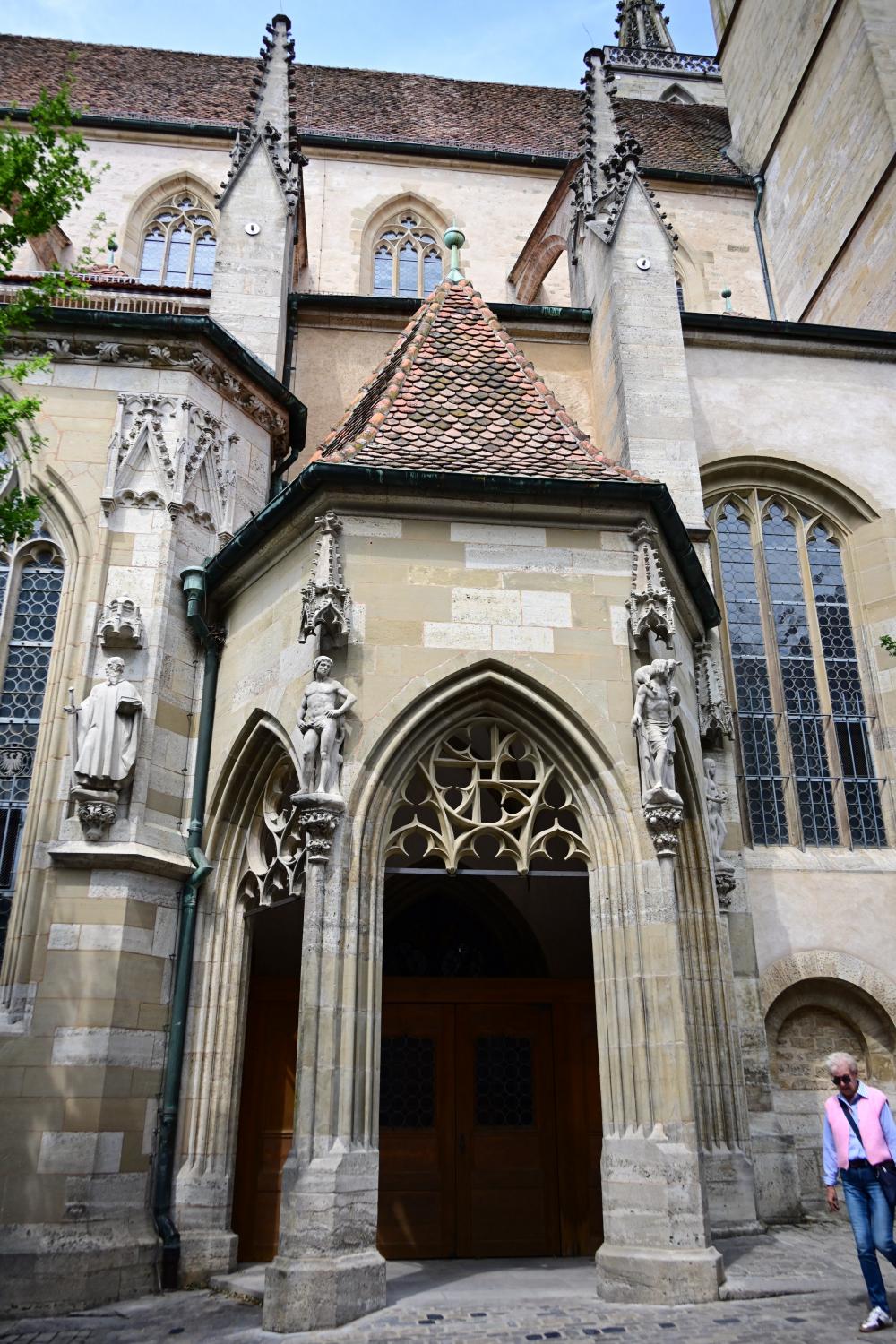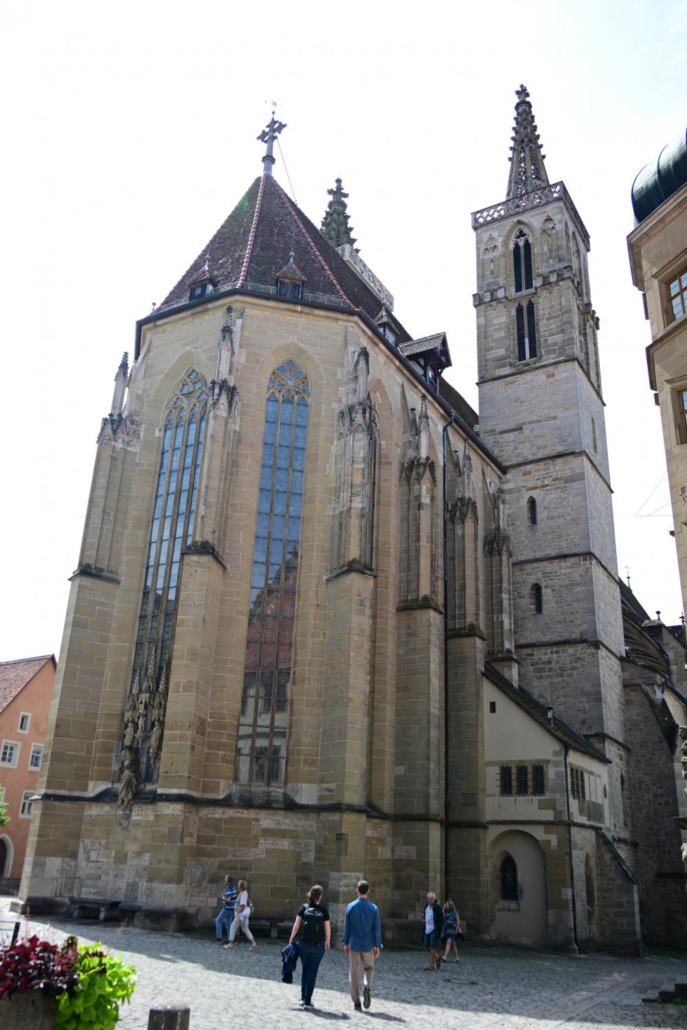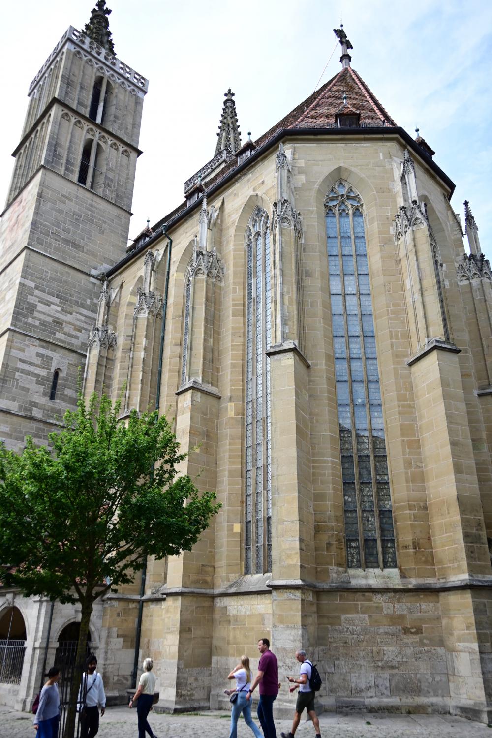 教堂属于典型的哥特式建筑,外观以高耸的塔楼为显著特征,塔楼高度达67米,登顶后可将罗腾堡古城的红屋顶与陶伯河谷的景致尽收眼底。教堂主体采用当地浅色石灰岩建造,历经岁月打磨,石材呈现出古朴厚重的质感,与古城整体的中世纪氛围和谐相融,大尺寸的彩色玻璃窗更是哥特式建筑的经典元素。