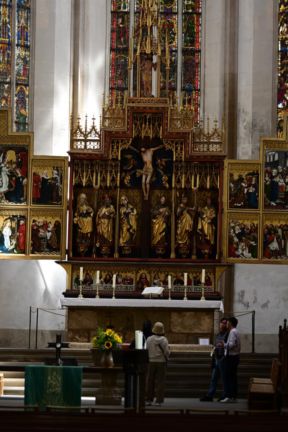 教堂内部珍藏着诸多艺术珍品,其中最负盛名的是蒂尔曼・里门施耐德创作的圣血祭坛。相传祭坛供奉着基督的圣血,其木雕工艺精湛绝伦,展现了中世纪晚期德国木雕艺术的巅峰水准。