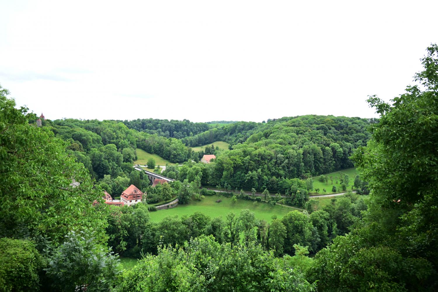 罗腾堡位于陶伯河上游河谷的高地上,周围环绕着起伏的丘陵、森林和沼泽,自然环境优美。陶伯河从城边蜿蜒而过,形成天然屏障,其支流罗腾布伦纳河穿城而过,为古城增添了灵动气息。城外的陶伯河谷是徒步和骑行的热门区域,游客可沿河谷步道欣赏田园风光,其中的双桥是中世纪贸易路线的遗迹,二战期间被毁后按原样重建,现为观景胜地。