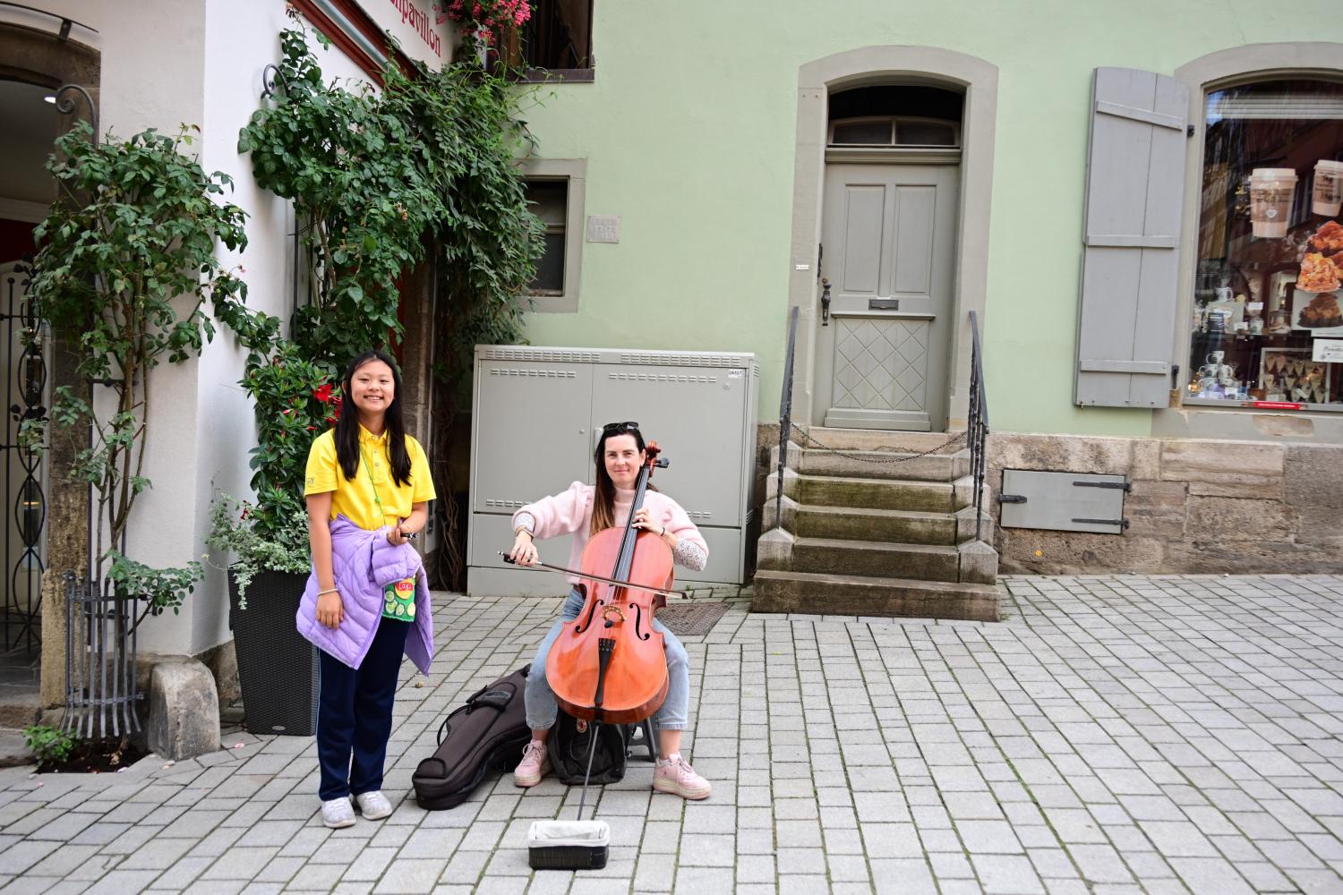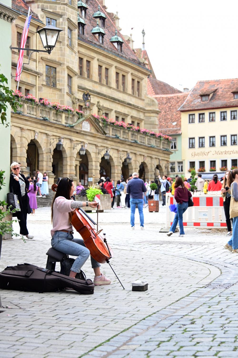 又走到了市集广场的位置,大提琴的出现,让场景焕然一新。