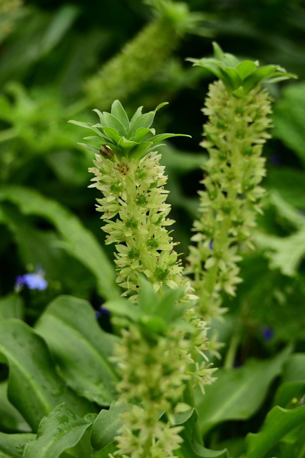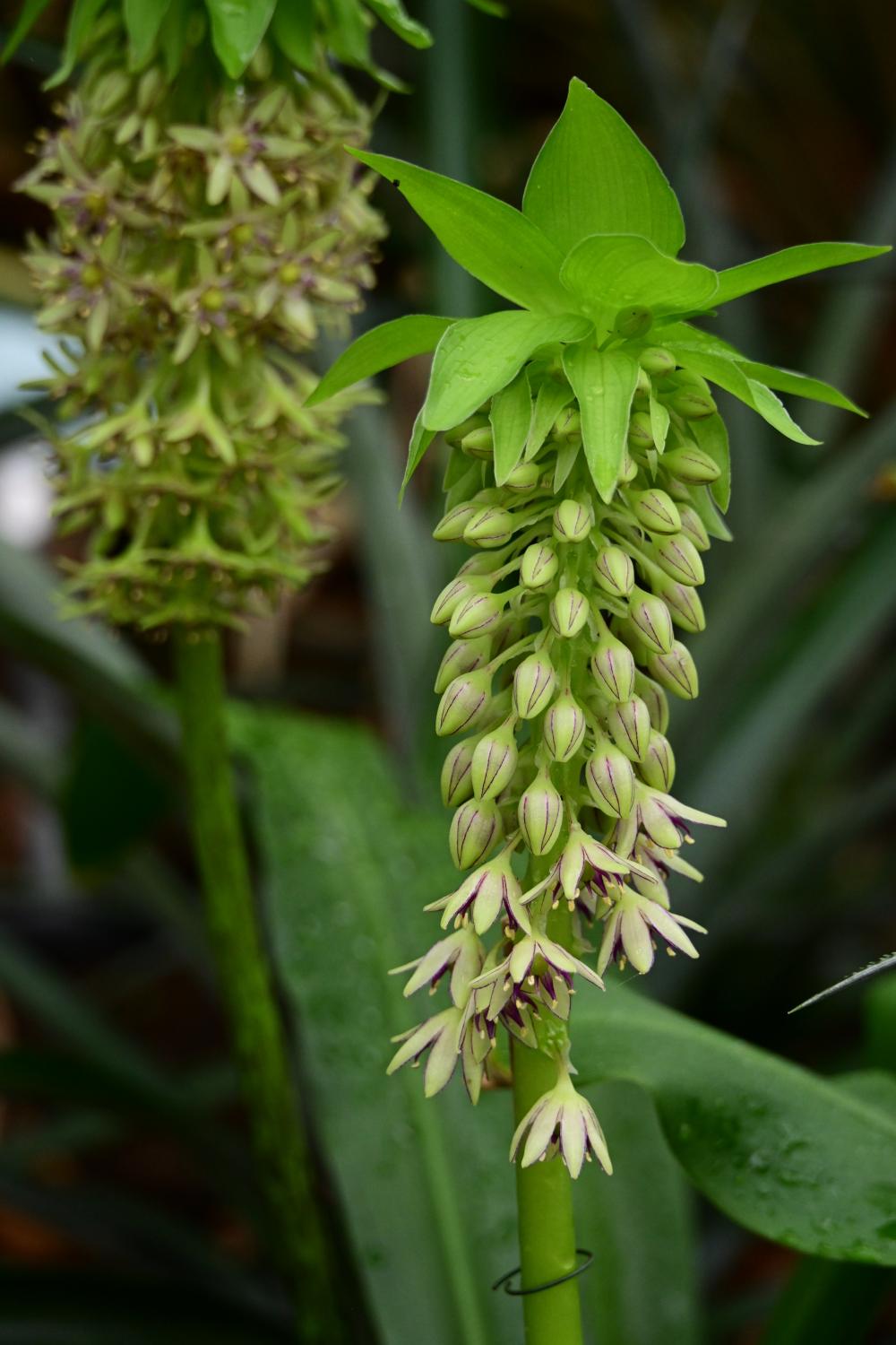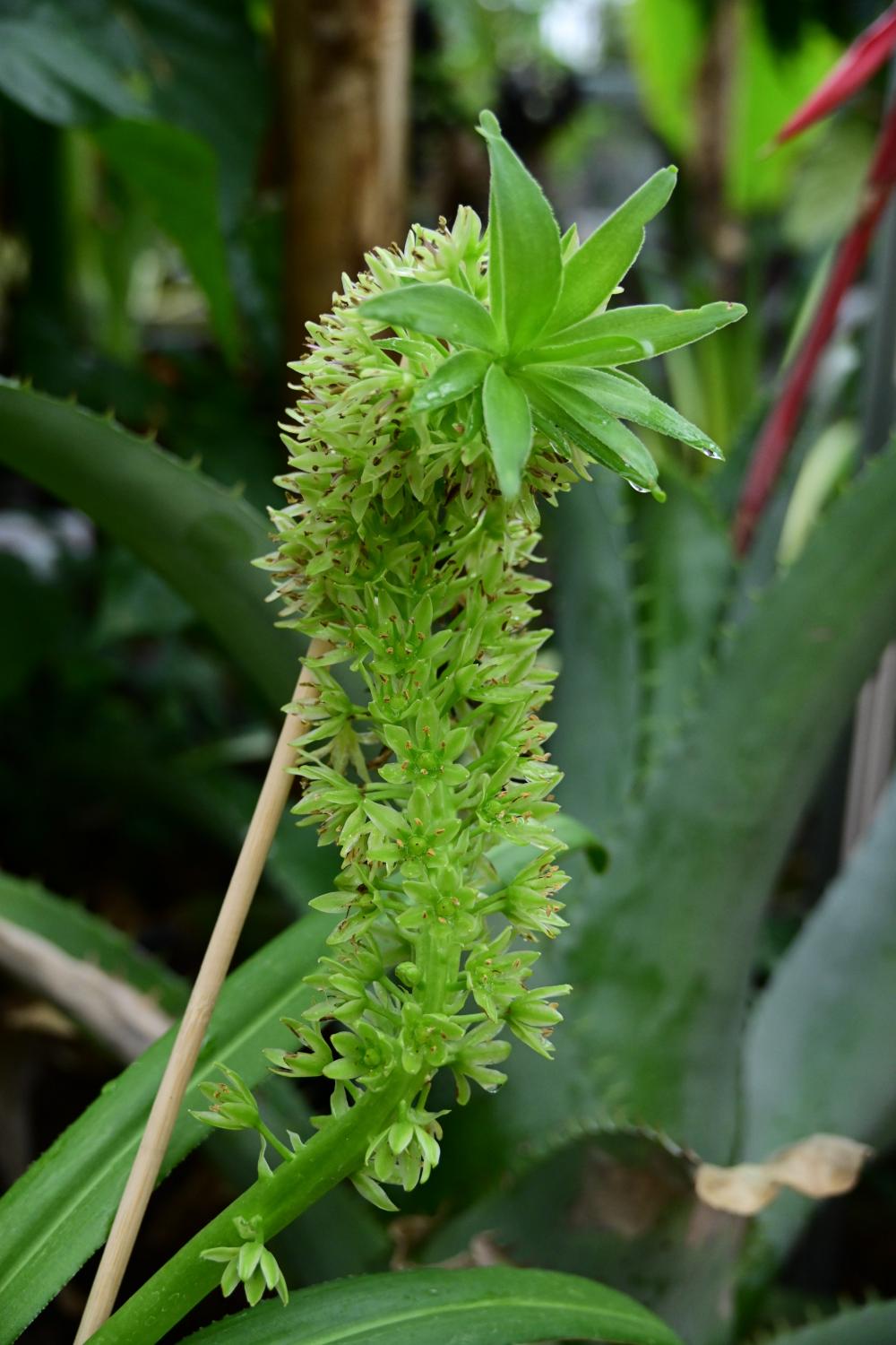 凤梨百合,也叫菠萝花,原产南非,穗状花序类似圆锥状,苞片密生,小花呈星形,排列成管形的莲座状叶丛,花语为 “完美”。花期很长,能从春季开到夏季。