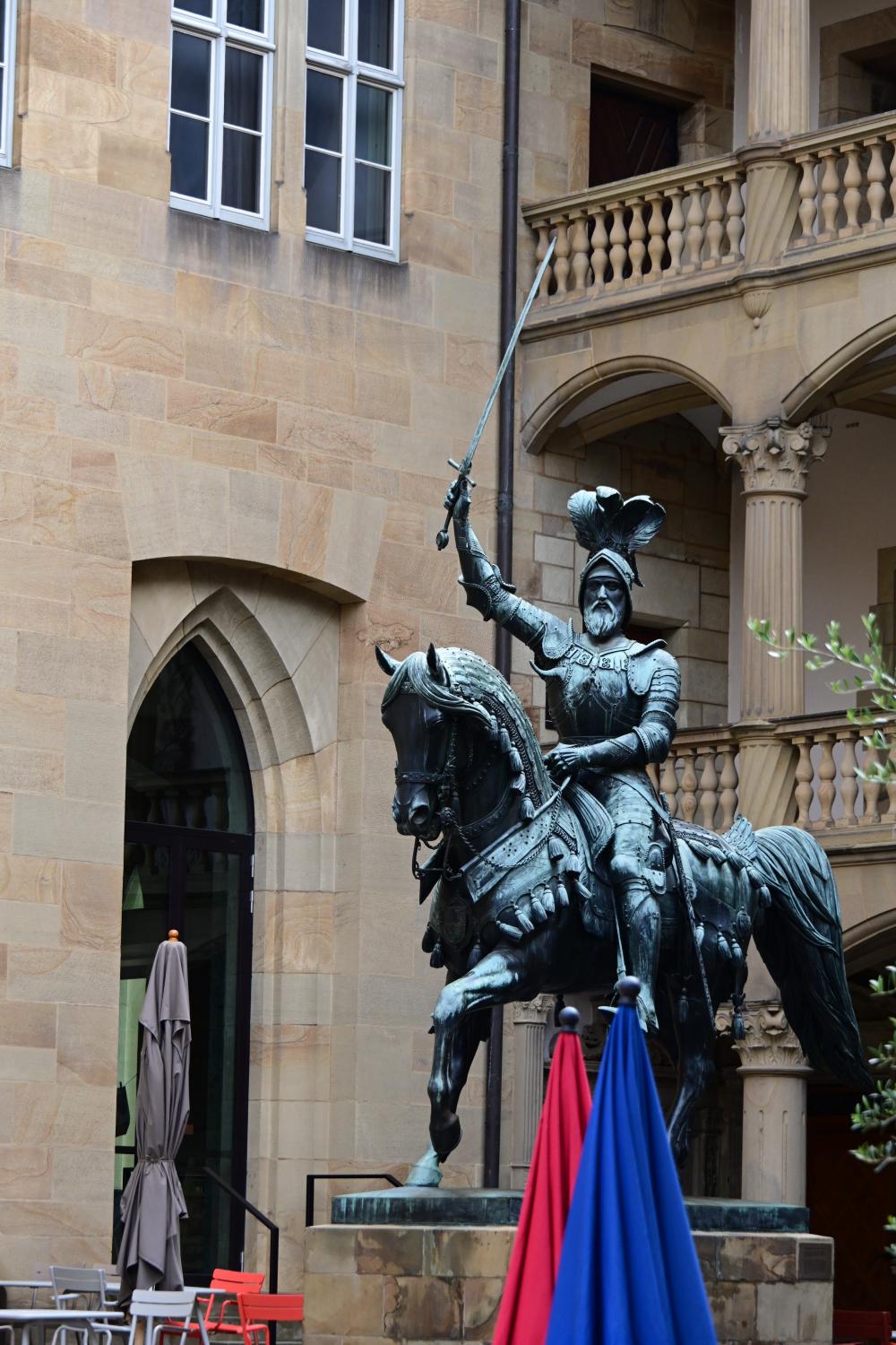转角处看到的雕像,大概率是符腾堡公爵艾伯哈德一世,雕像呈现其身着盔甲、手持长剑的姿态。
